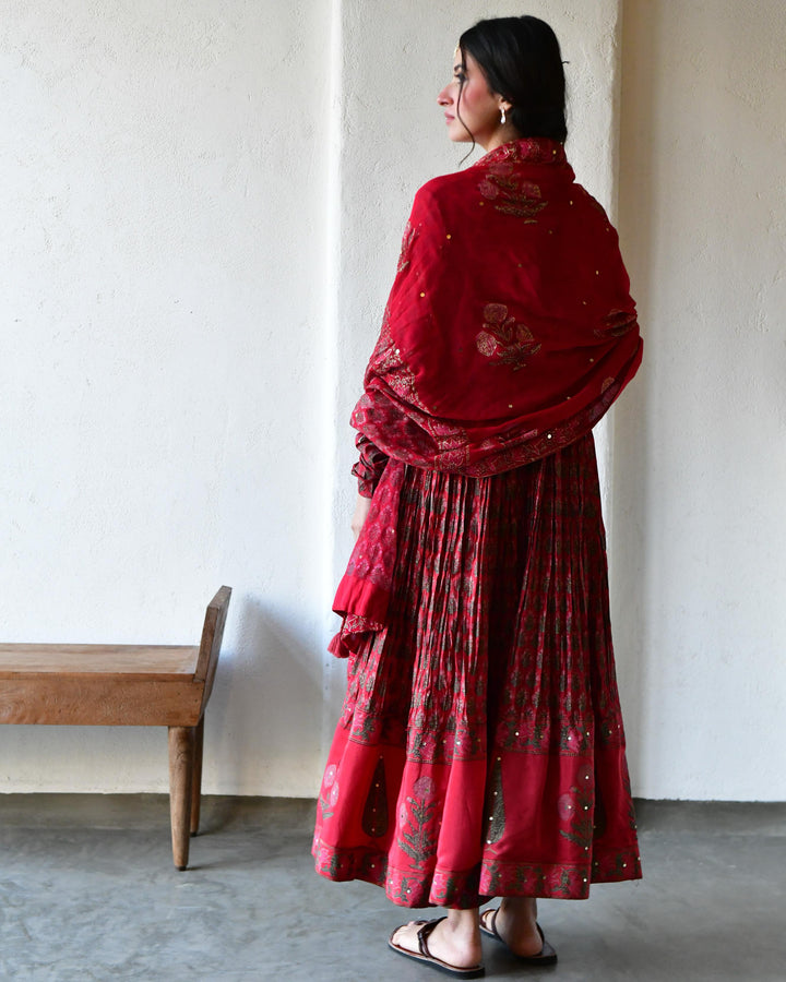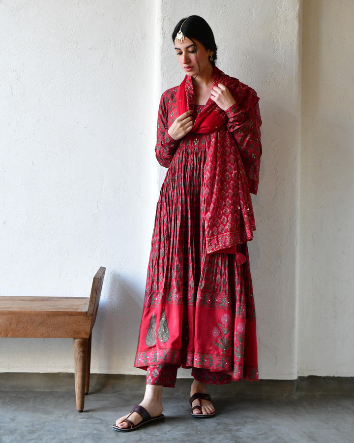 This three-piece set includes Anarkali, pants, and dupatta. Organic cotton Red handblockprinted anarkali with hand embroidery . Matching Pants in Organic cotton and organic mulmul handblockprinted dupatta.