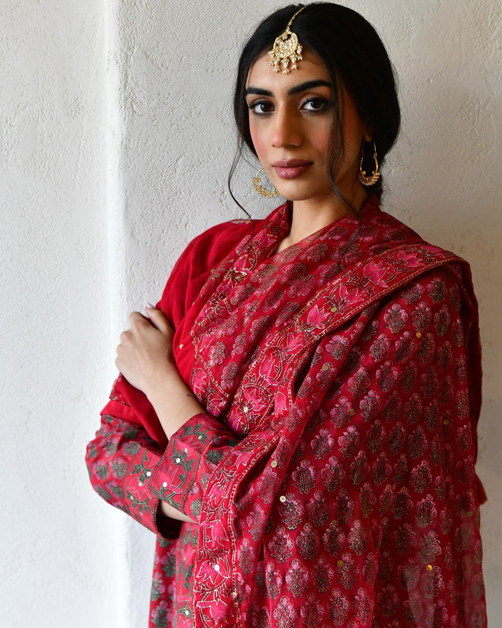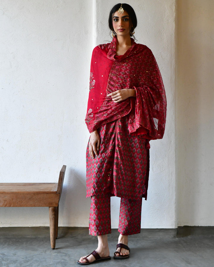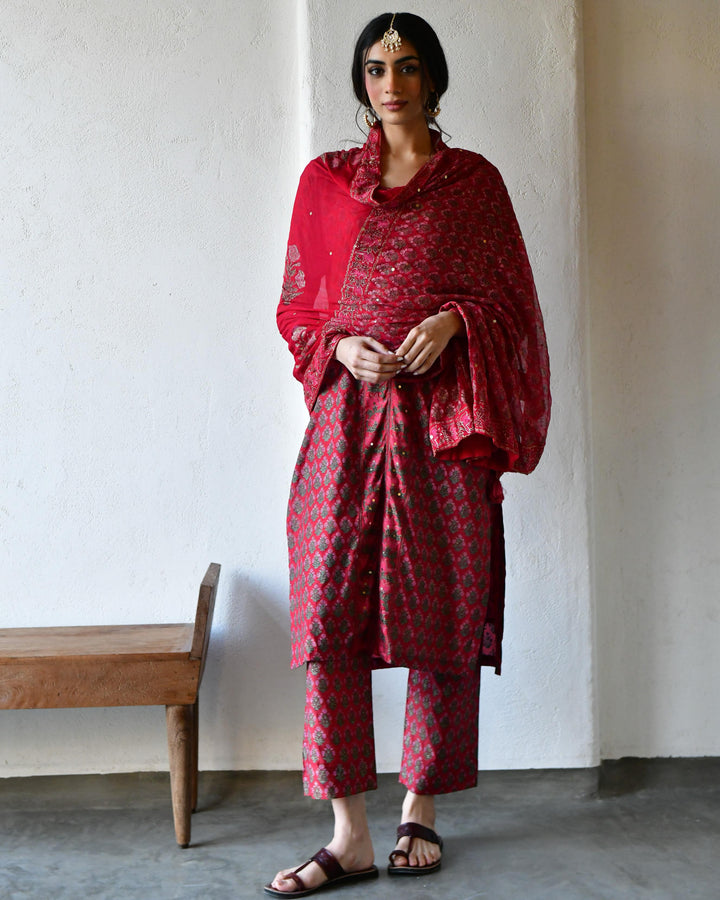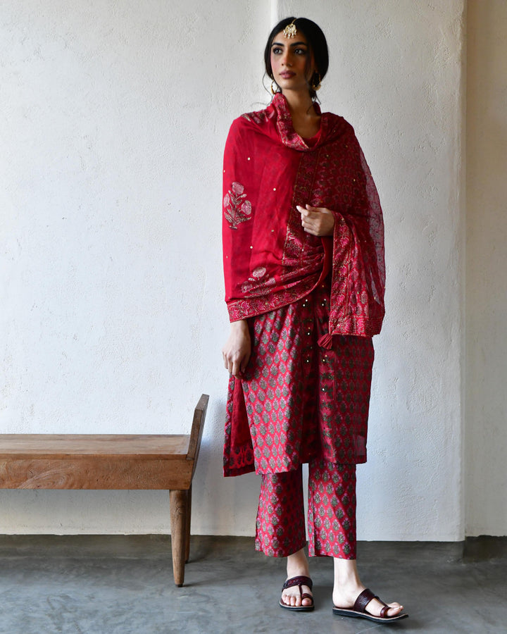 This three-piece set includes straight kurta, pants, and dupatta. Organic cotton Red handblockprinted straight kurta with hand embroidery . Matching Pants in Organic cotton and organic mulmul handblockprinted dupatta.