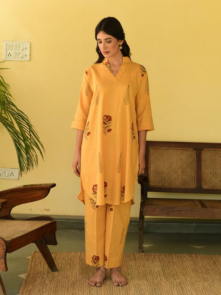 This three-piece set includes straight short kurta amd pants. South cotton block printed straight short kurta with handwork detailing. Pants has elasticated waist.