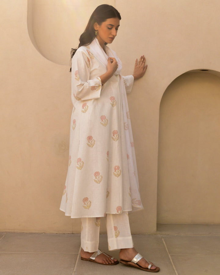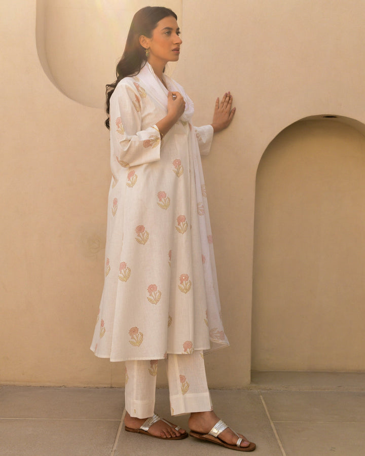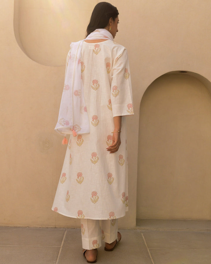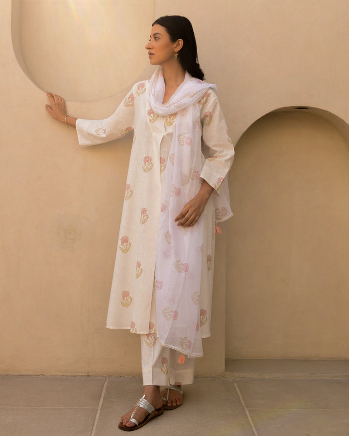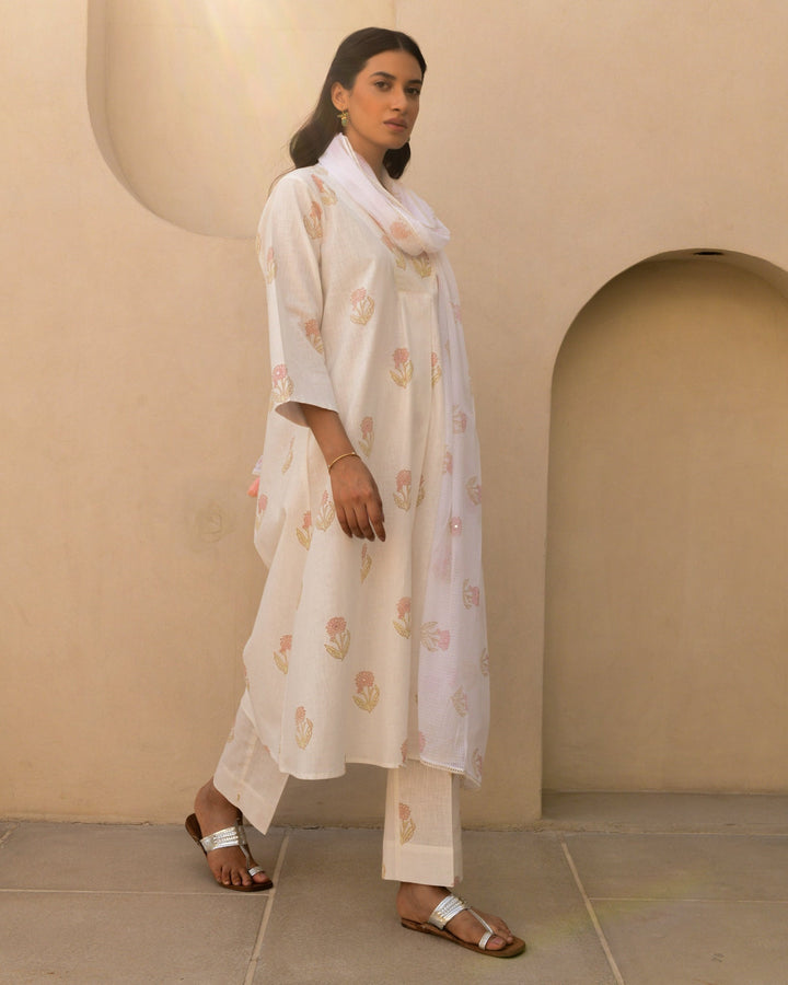 This three-piece set includes a kurta, pants, and a dupatta. High-quality handblockprinted cotton Kurta and matching pants. Doria dupatta with gotta detailing.