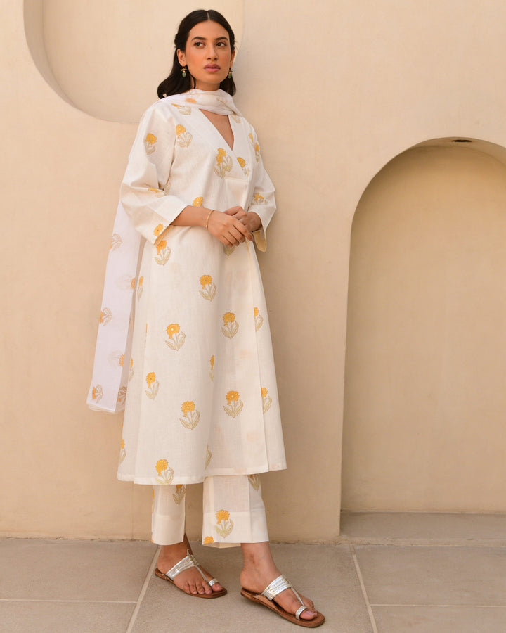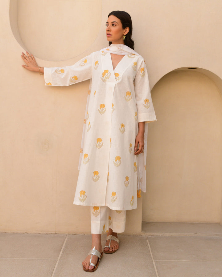 This three-piece set includes a kurta, pants, and a dupatta. High-quality handblockprinted cotton Kurta and matching linen pants . Doria dupatta with gotta detailing.