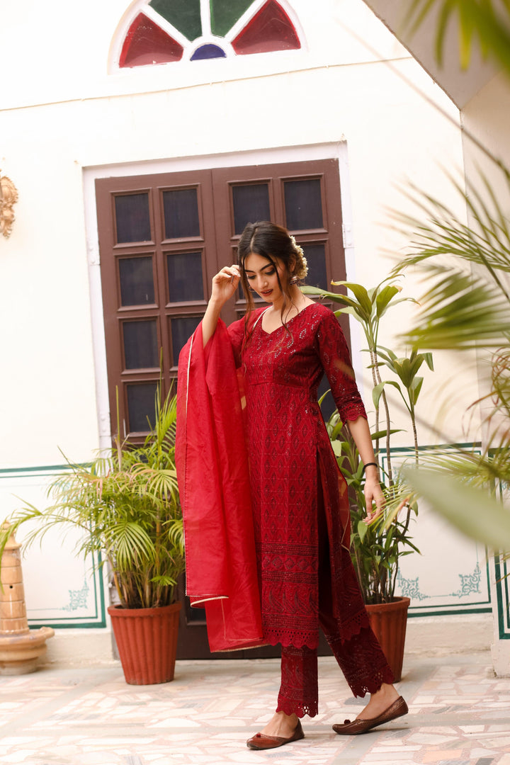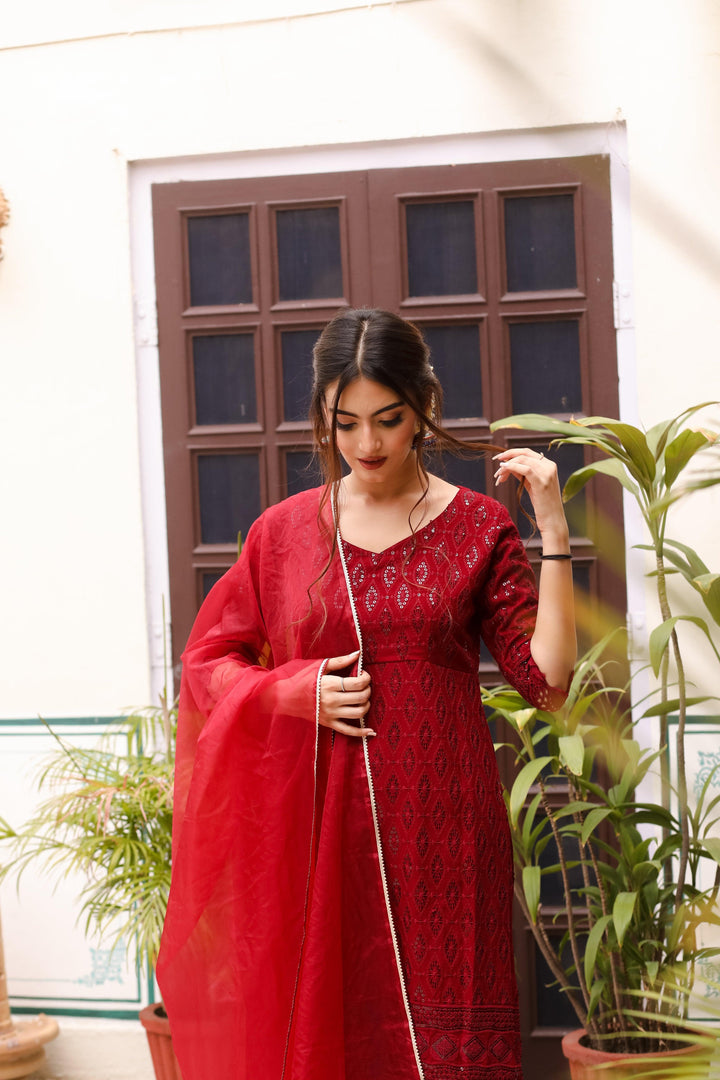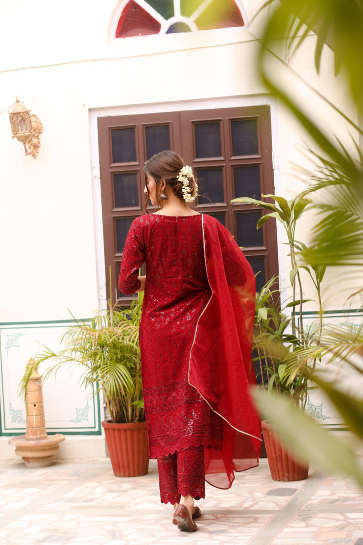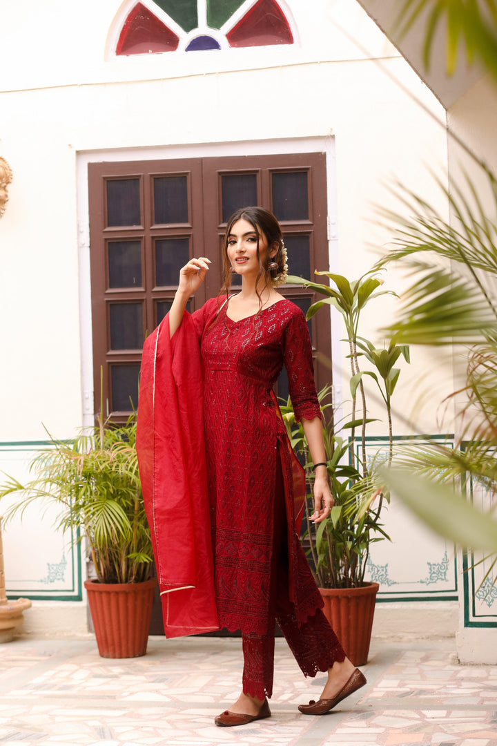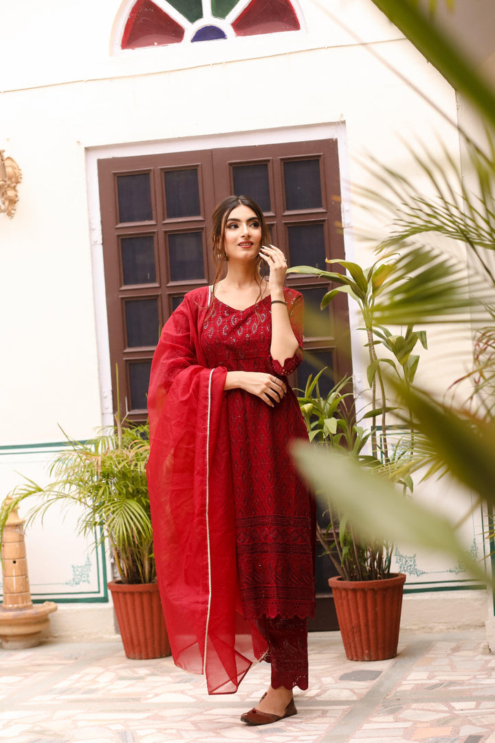 This three-piece set includes Kurta, pants, and dupatta. Maroon rayon kurta with all over all over embroidery work. Maroon pants with embroidery work on edges and elasticated waist. Maroon organza dupatta with gota detailing.
