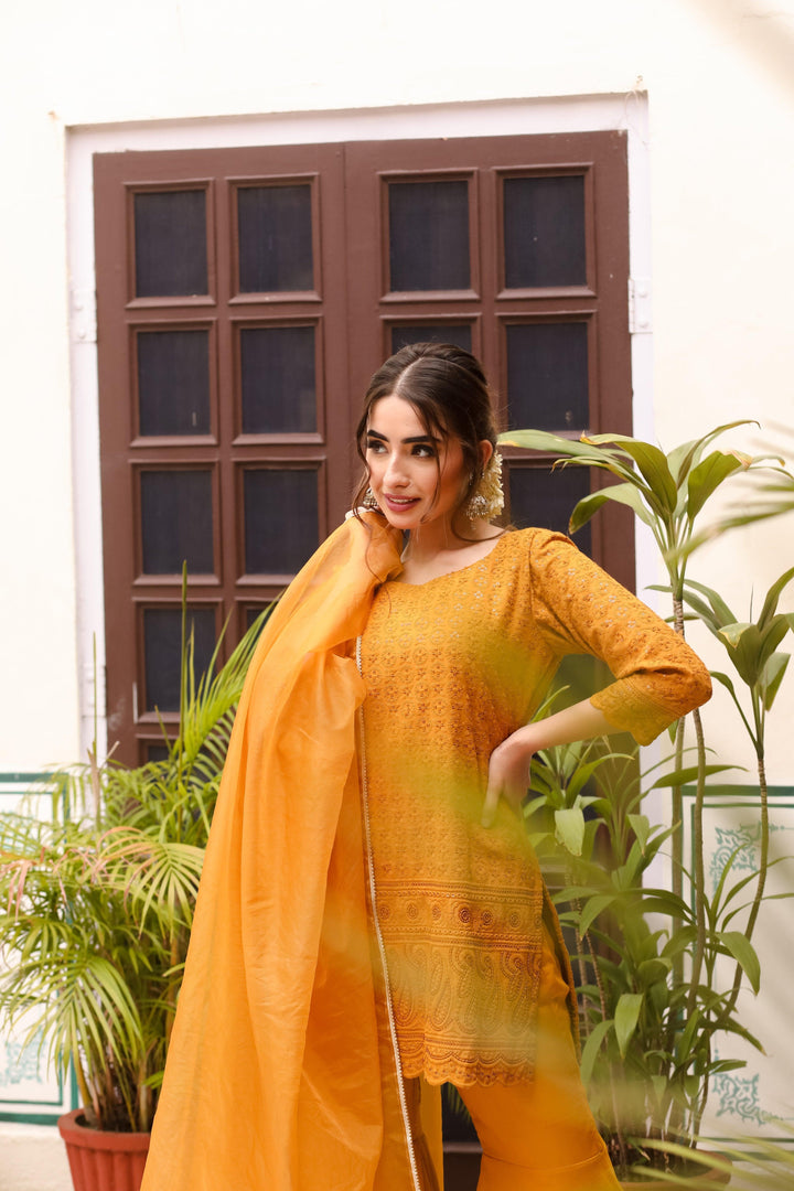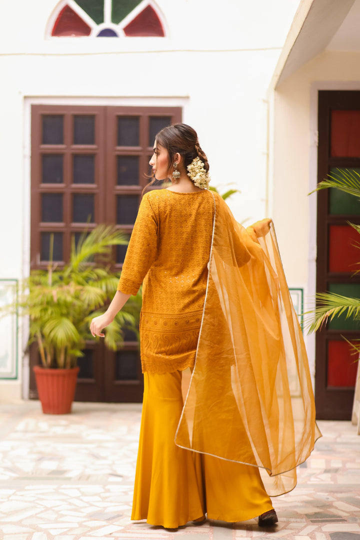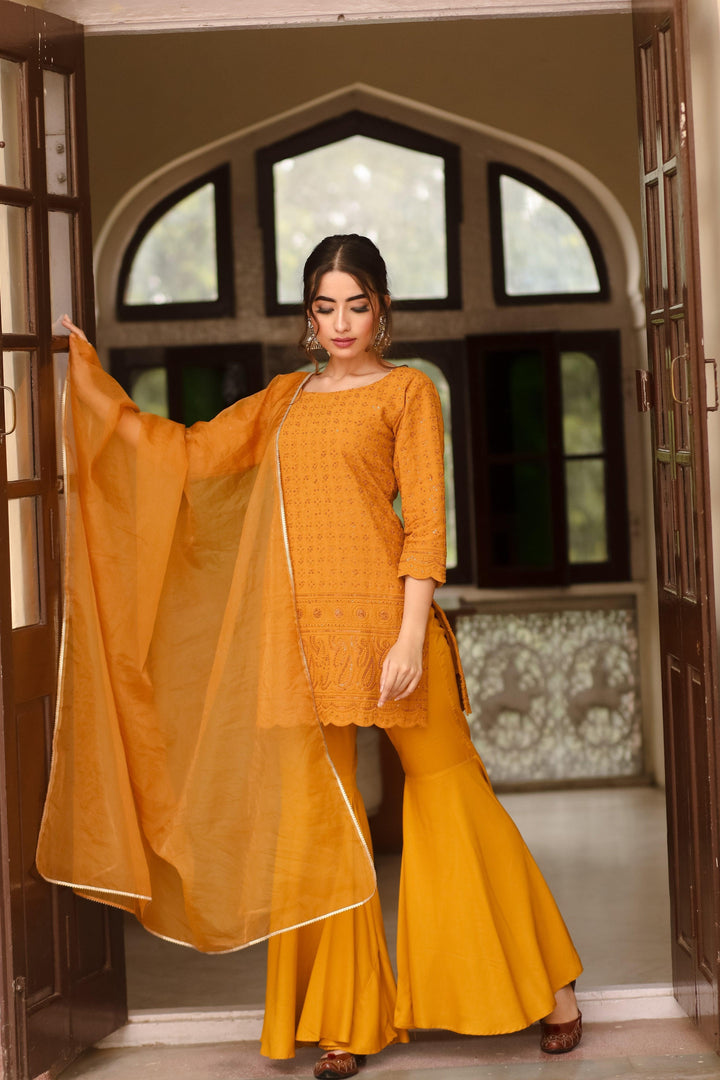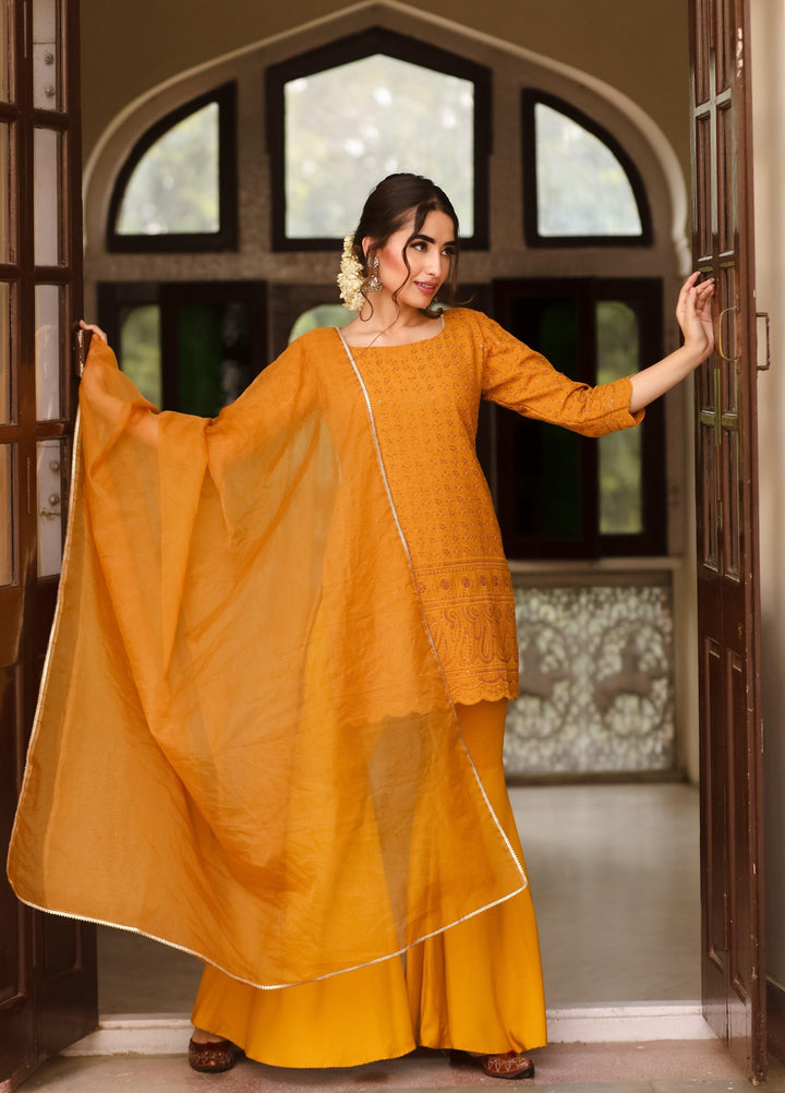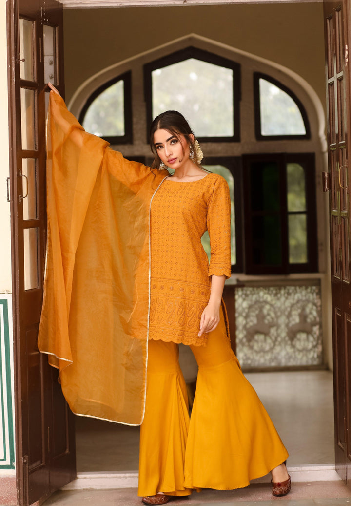 This three-piece set includes kurta, sharara, and dupatta. Mustard rayon kurta with all over all over embroidery work. Mustard sharara with elasticated waist. Mustard organza dupatta with gota detailing.