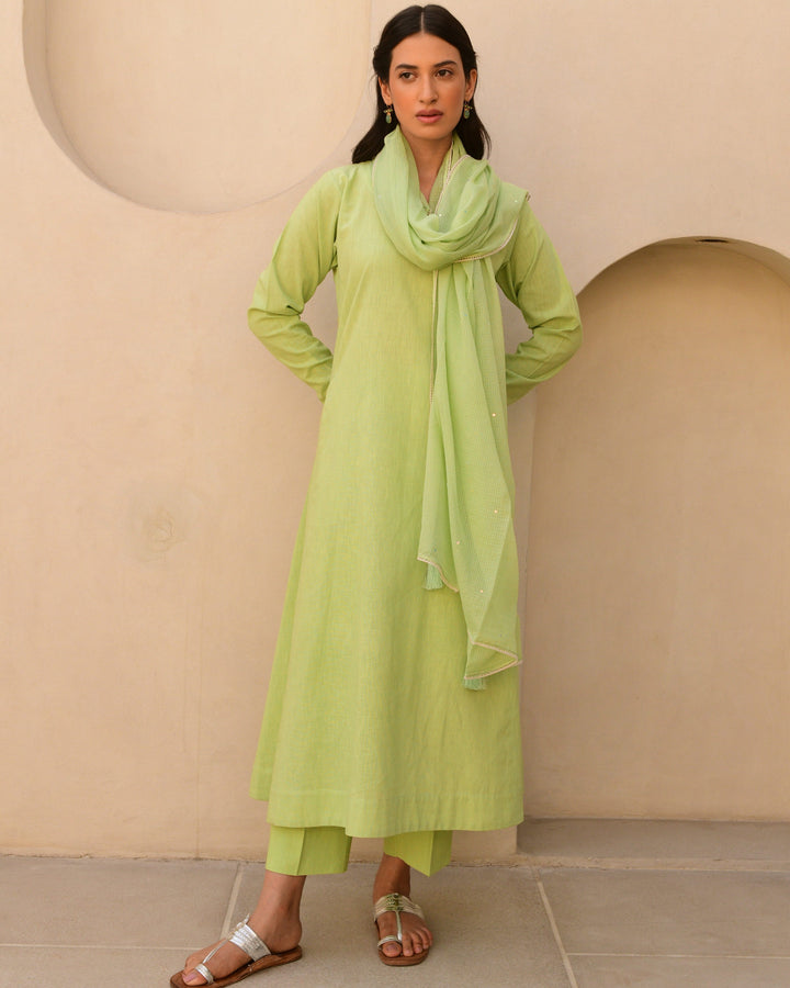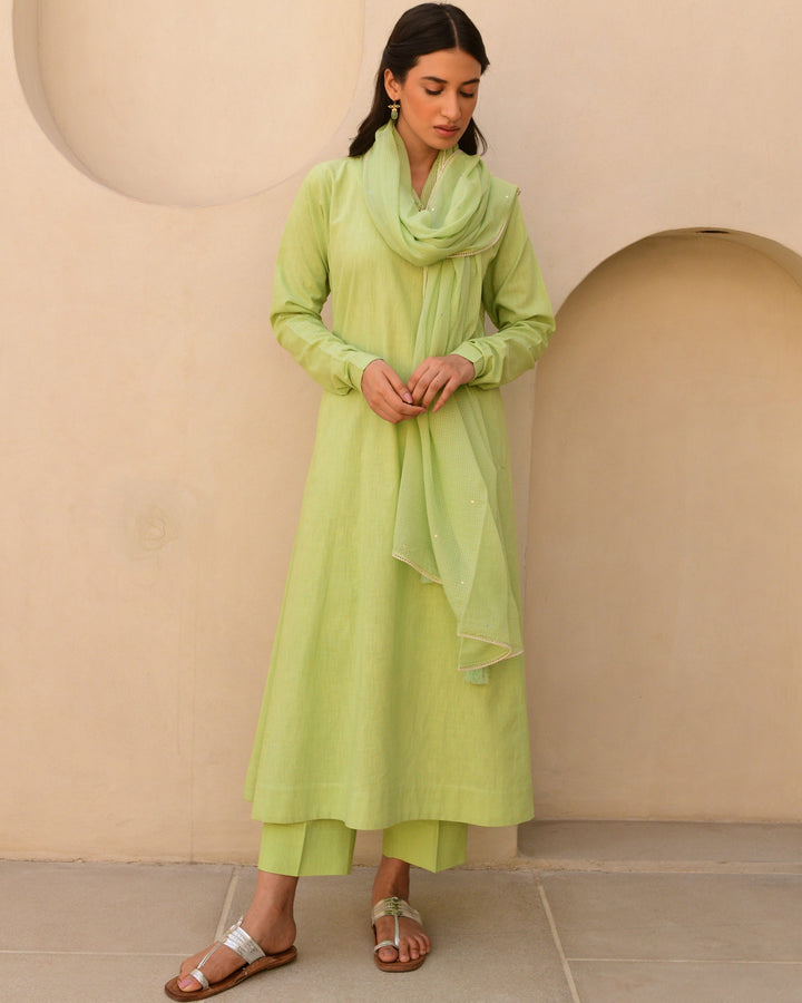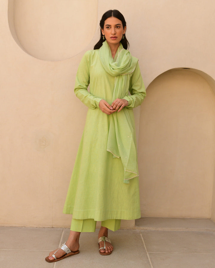 This three-piece set includes a kurta, pants, and a dupatta. High-quality cotton Kurta and matching pants. Doria dupatta with gotta detailing.