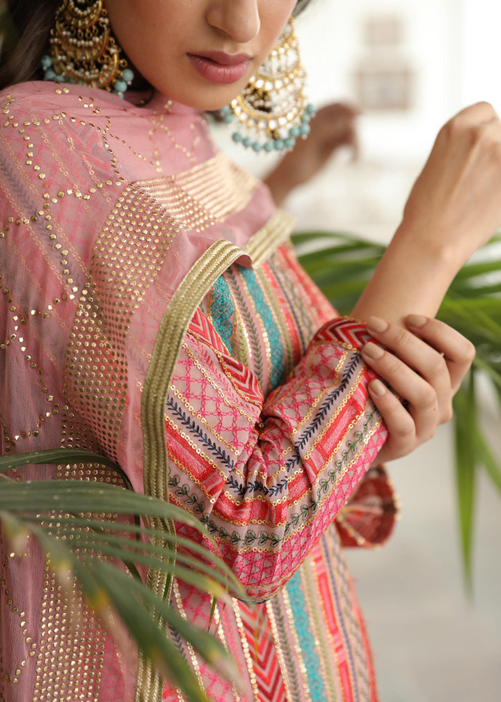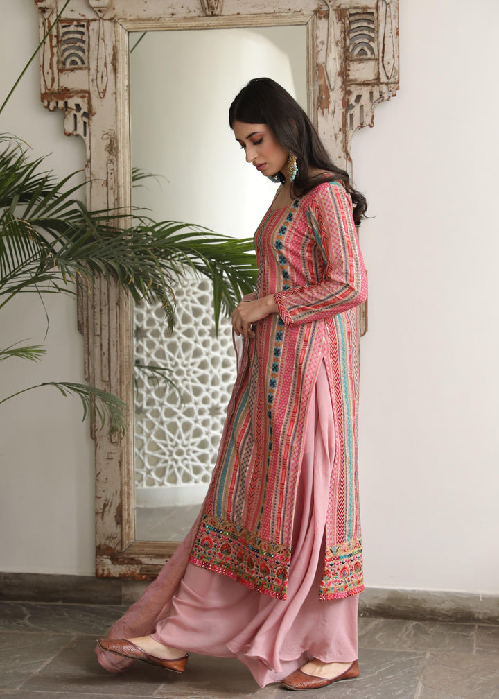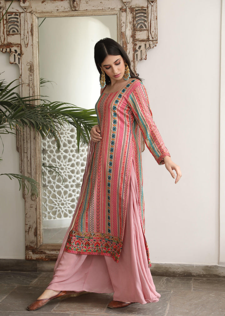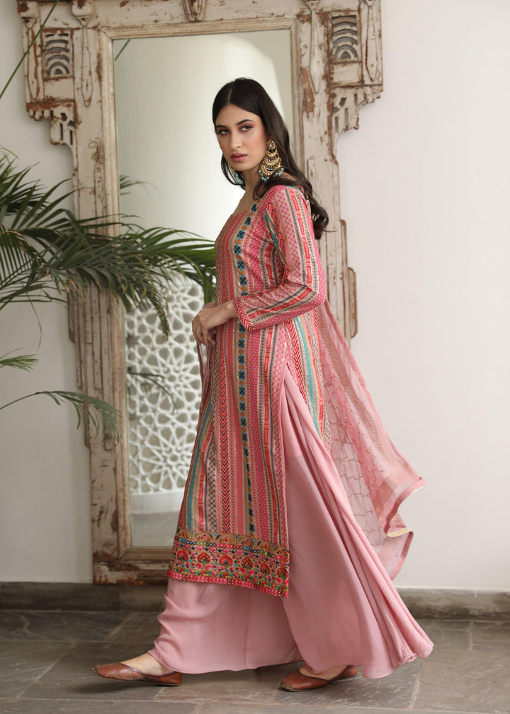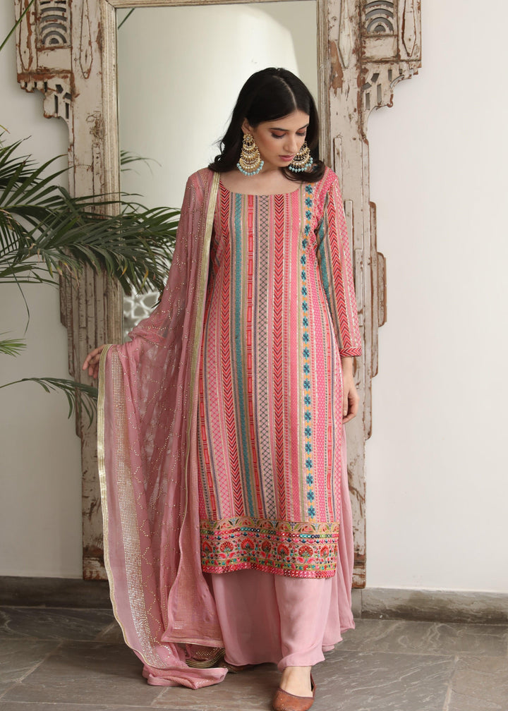 This three-piece set includes Kurta, palazzo, and dupatta. Taffy Pink Pure-Georgette Straight kurta with heavy embroidery. Taffy pink Full flared palazzo with elasticated waist. Taffy pink chiffon heavy dupatta with gotta detailing.