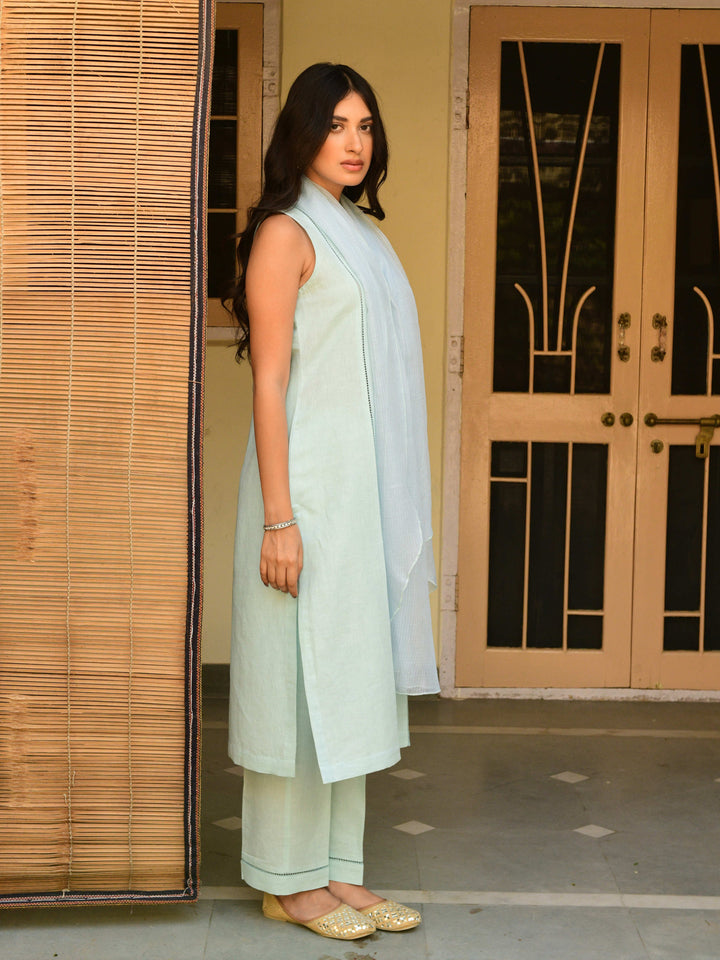 This three-piece set includes a kurta, pants, and a dupatta. High-quality Linen Kurta with less detailing and matching linen pants with less detailing.Doria dupatta with hand working gotta detailing.