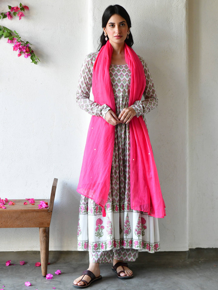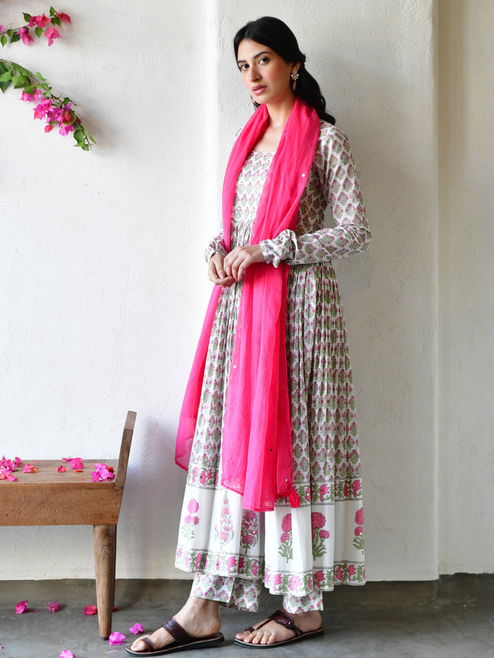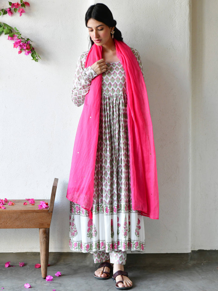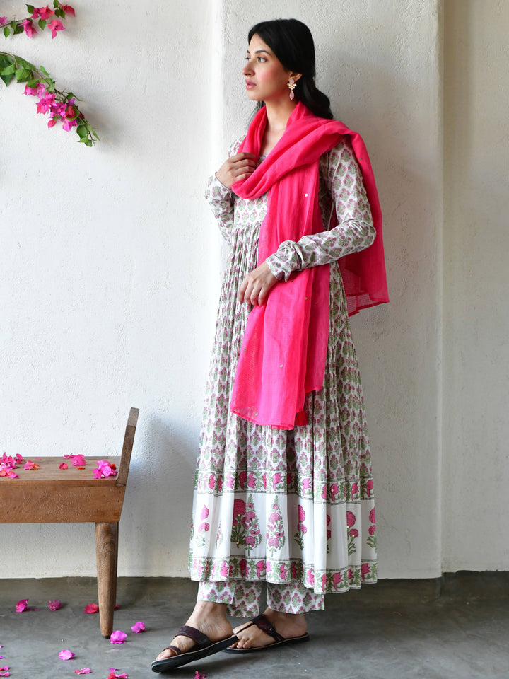 This three-piece handblockprinted set includes Anarkali, pants, and dupatta. Organic cotton gulabi hand block printed anarkali with handwork detailing.Matching handblockprinted Pants in organic cotton and soft doria dupatta in gulabi.