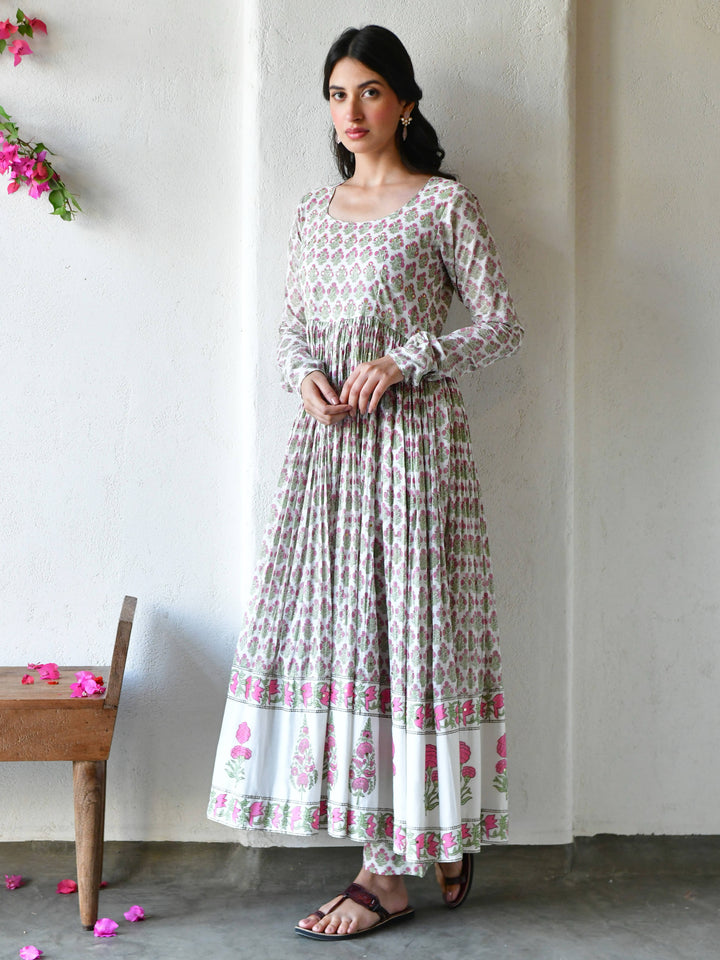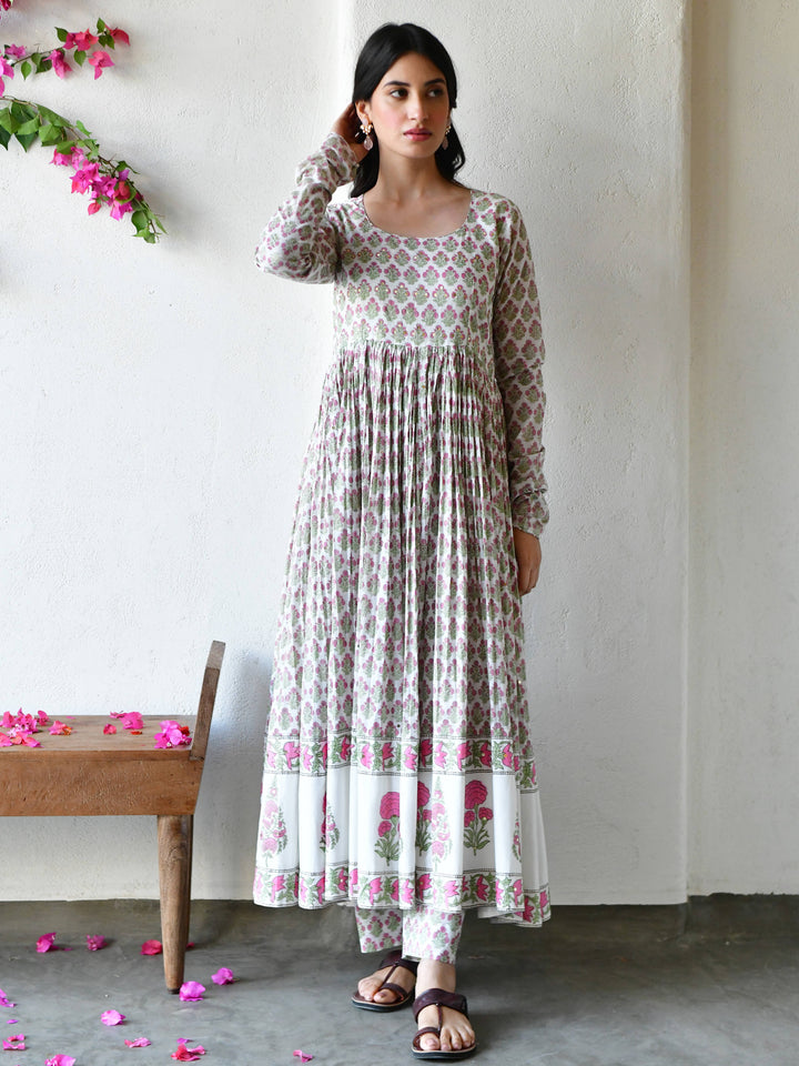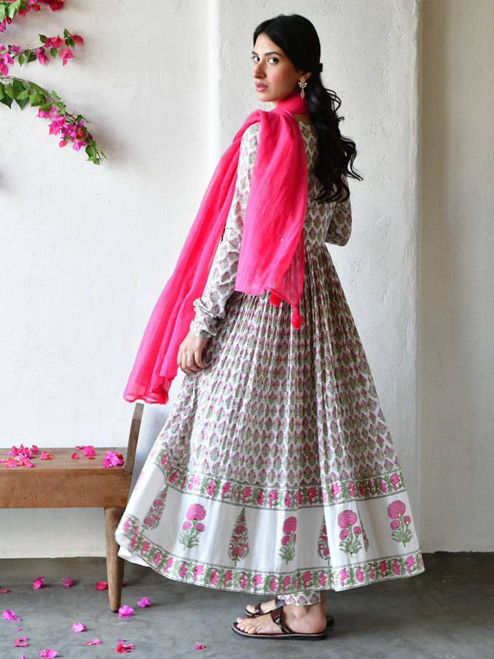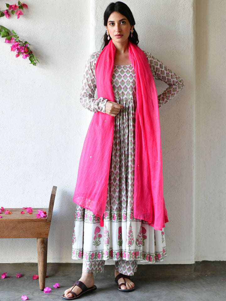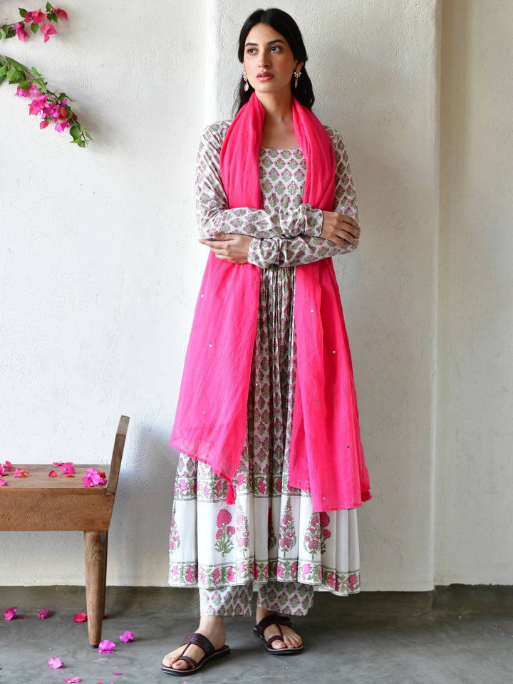 This three-piece handblockprinted set includes Anarkali, pants, and dupatta. Organic cotton gulabi hand block printed anarkali with handwork detailing.Matching handblockprinted Pants in organic cotton and soft doria dupatta in gulabi.
