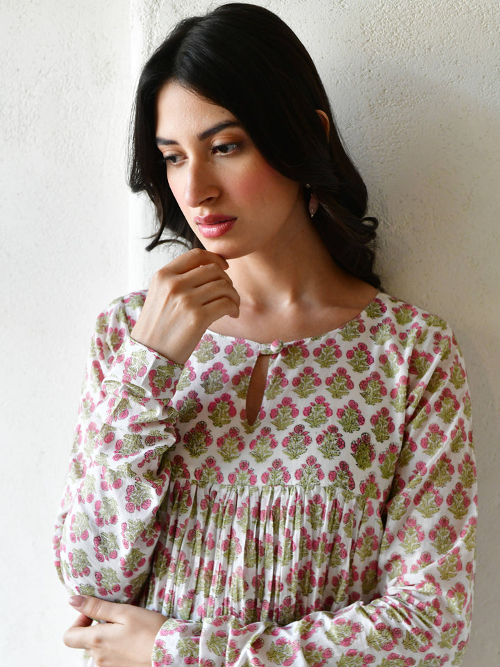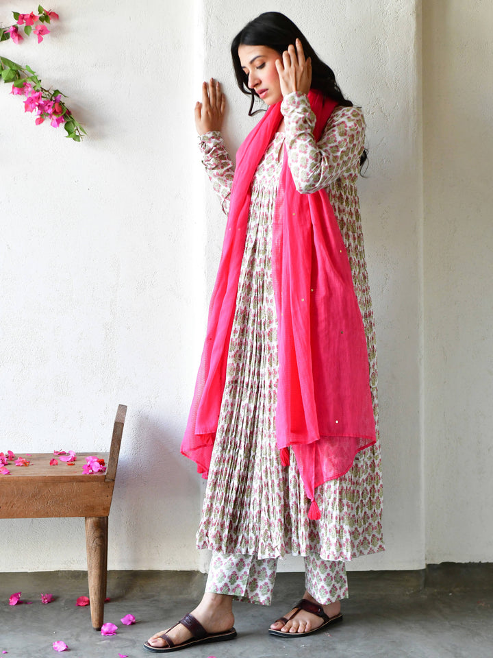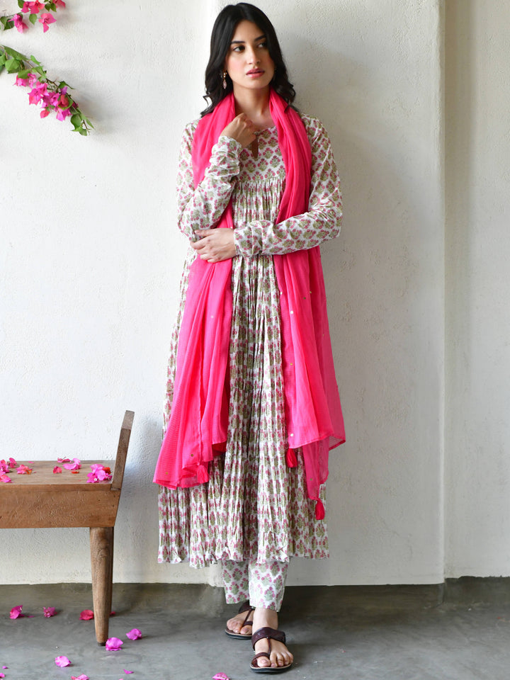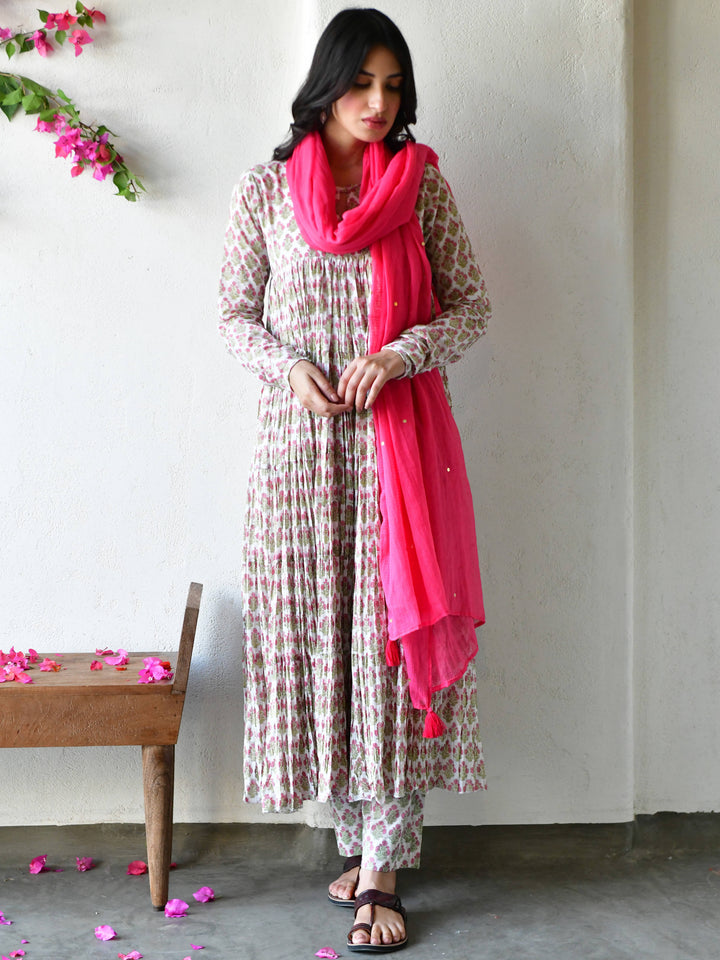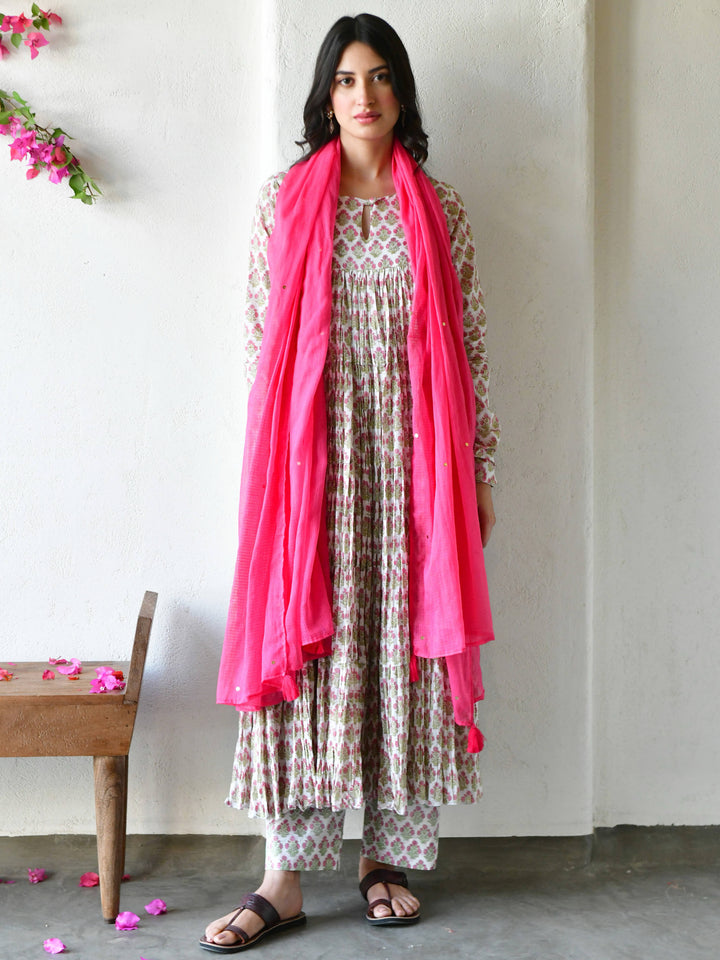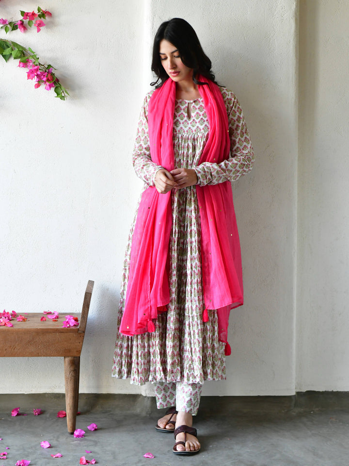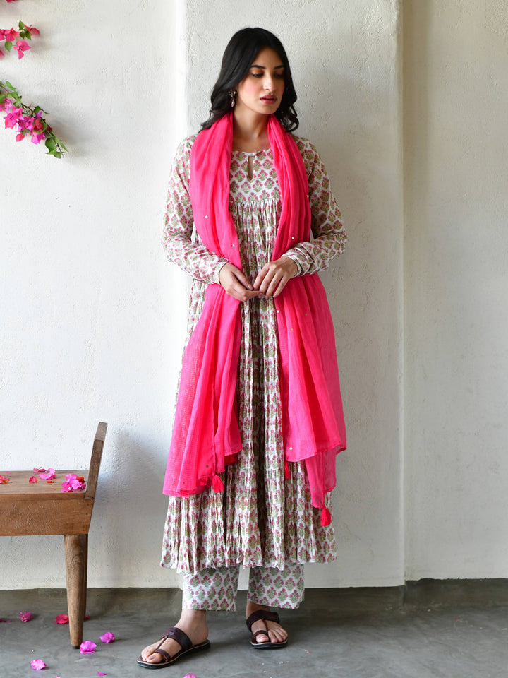 This three-piece handblockprinted set includes tier Anarkali, pants, and dupatta. Organic cotton gulabi hand block printed tier anarkali with handwork detailing.Matching handblockprinted Pants in organic cotton and soft doria dupatta in gulabi.