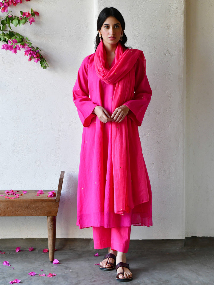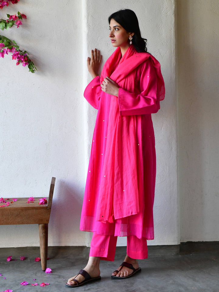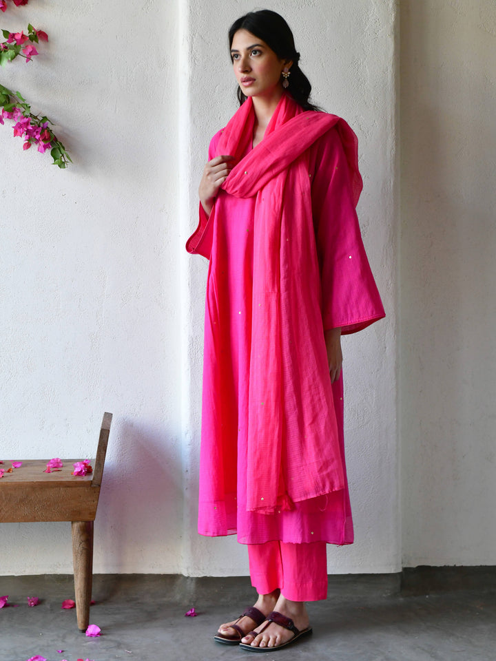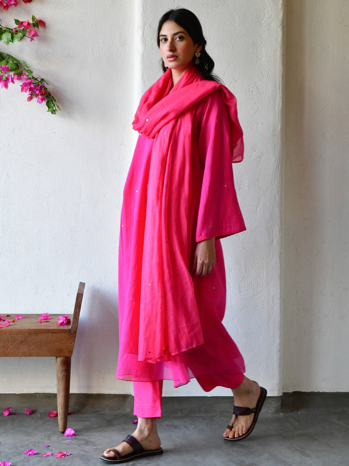 This three-piece set includes A-line kurta, pants, and dupatta. Organic cotton gulabi A-line kurta with handwork detailing.Matching gulabi Pants in organic cotton and soft doria dupatta in gulabi.