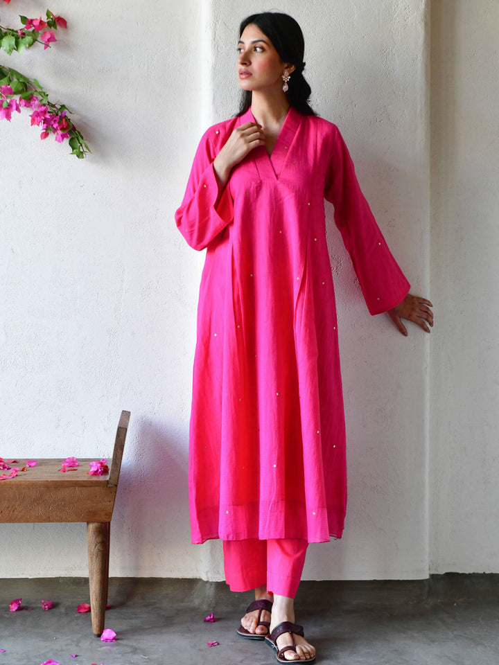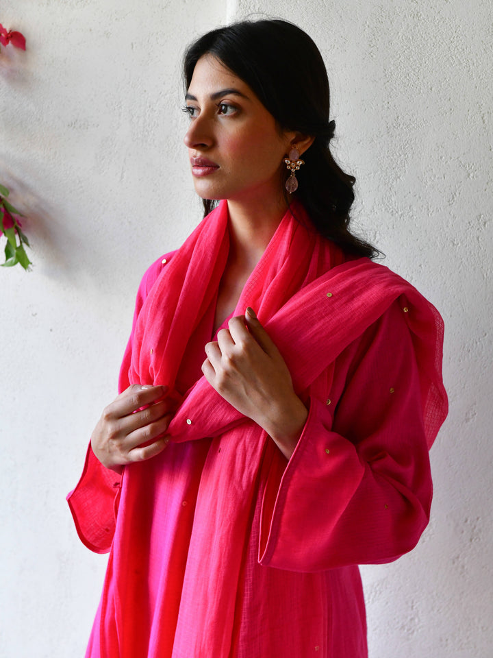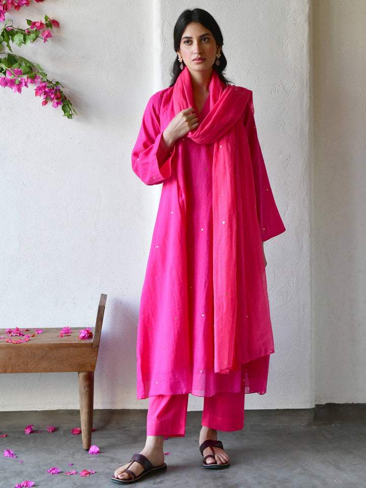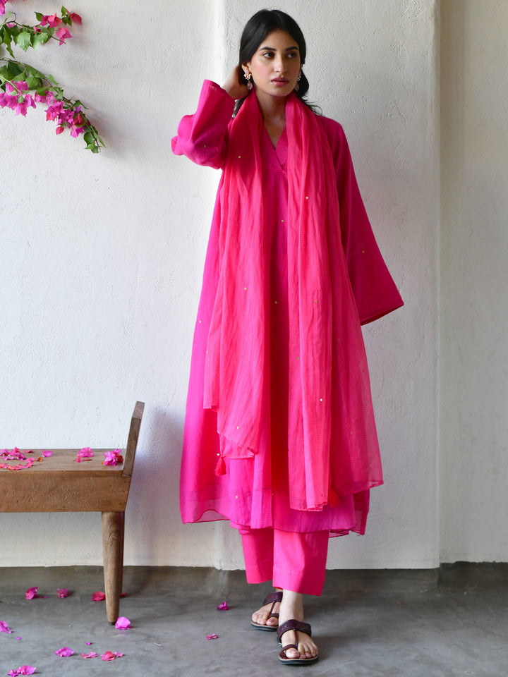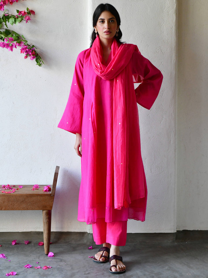 This three-piece set includes A-line kurta, pants, and dupatta. Organic cotton gulabi A-line kurta with handwork detailing.Matching gulabi Pants in organic cotton and soft doria dupatta in gulabi.