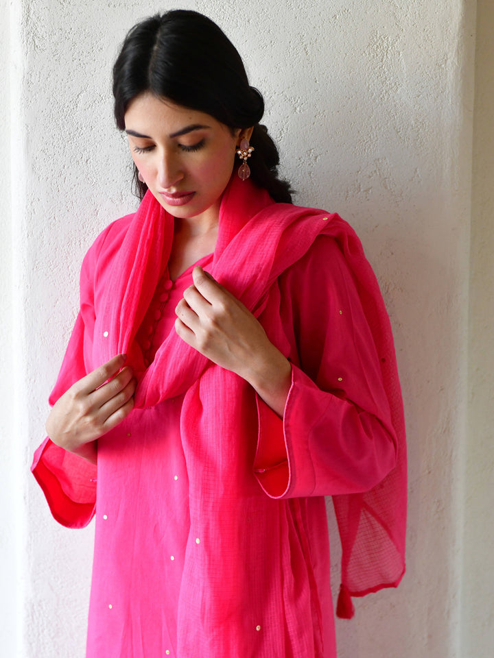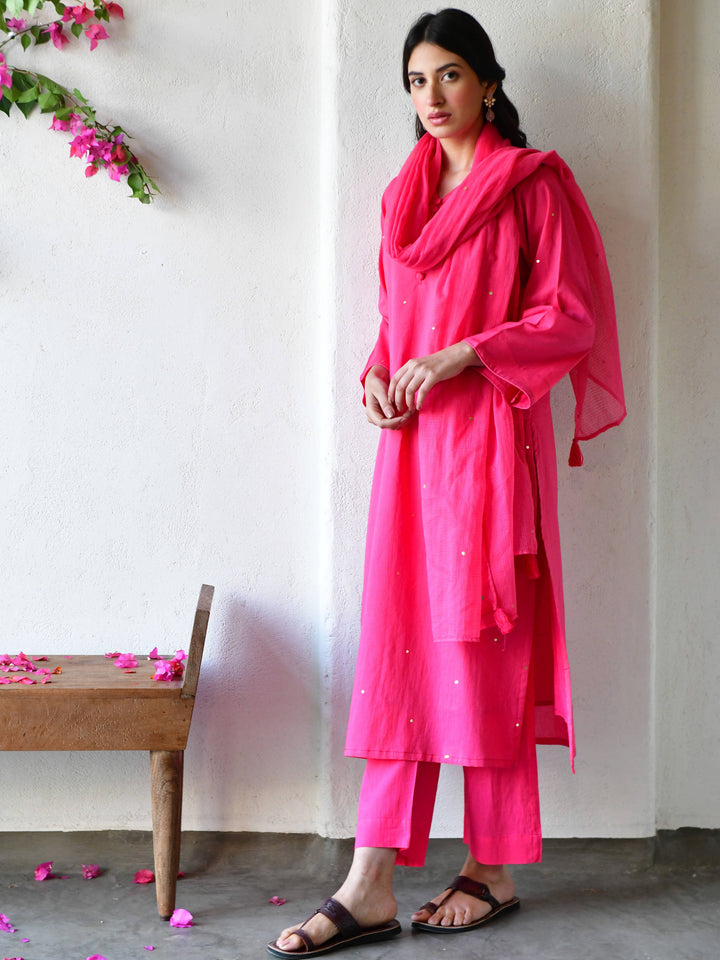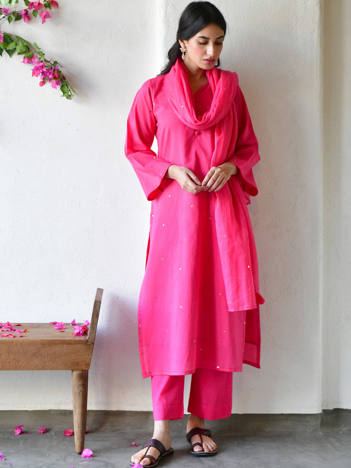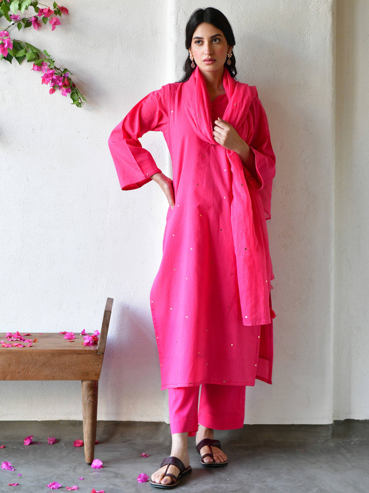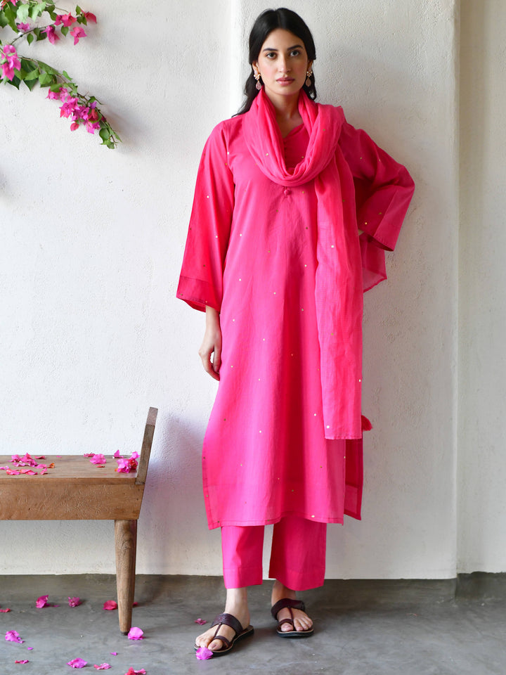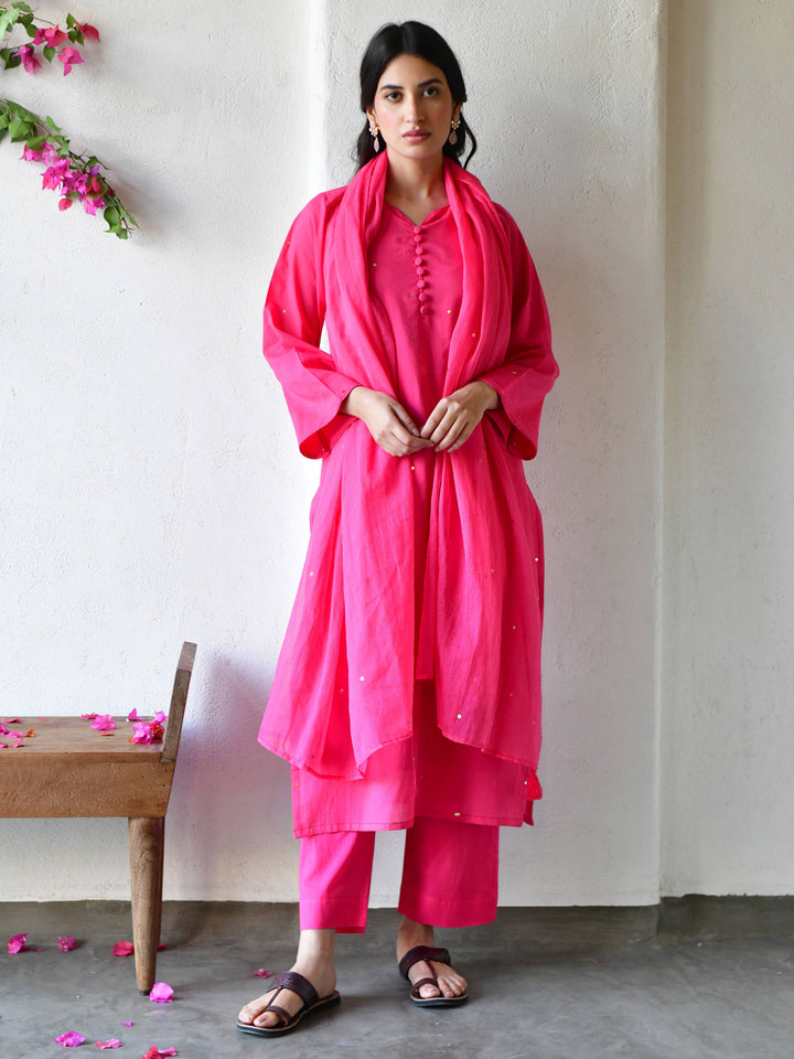 This three-piece set includes straight kurta , pants, and dupatta. Organic cotton gulabi straight kurta with handwork detailing.Matching Pants in organic cotton and soft doria dupatta in gulabi.
