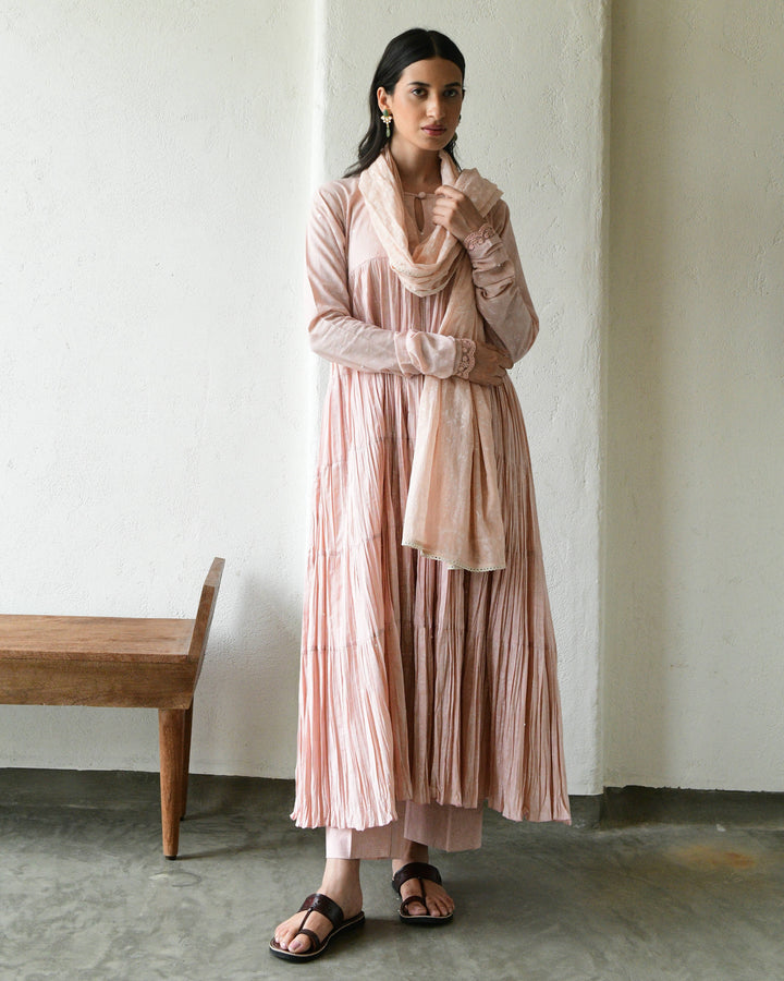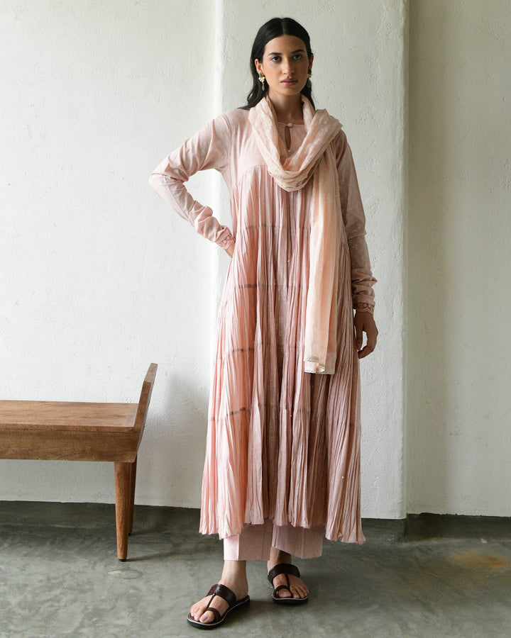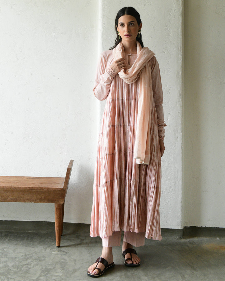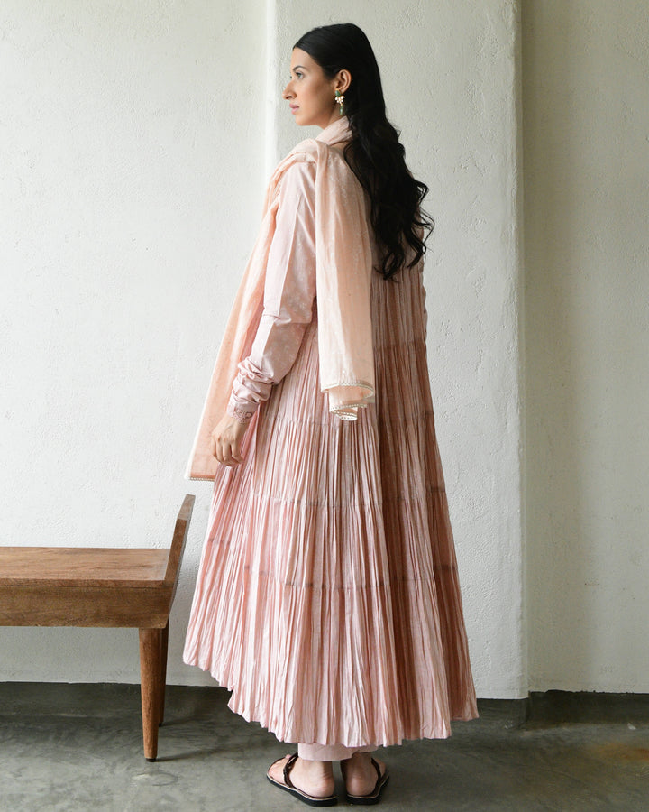This three-piece set includes Anarkali, pants, and dupatta. Organic cotton khari hand block printed tier anarkali with lace detailing.Pants and mulmul dupatta in khari hand block printed