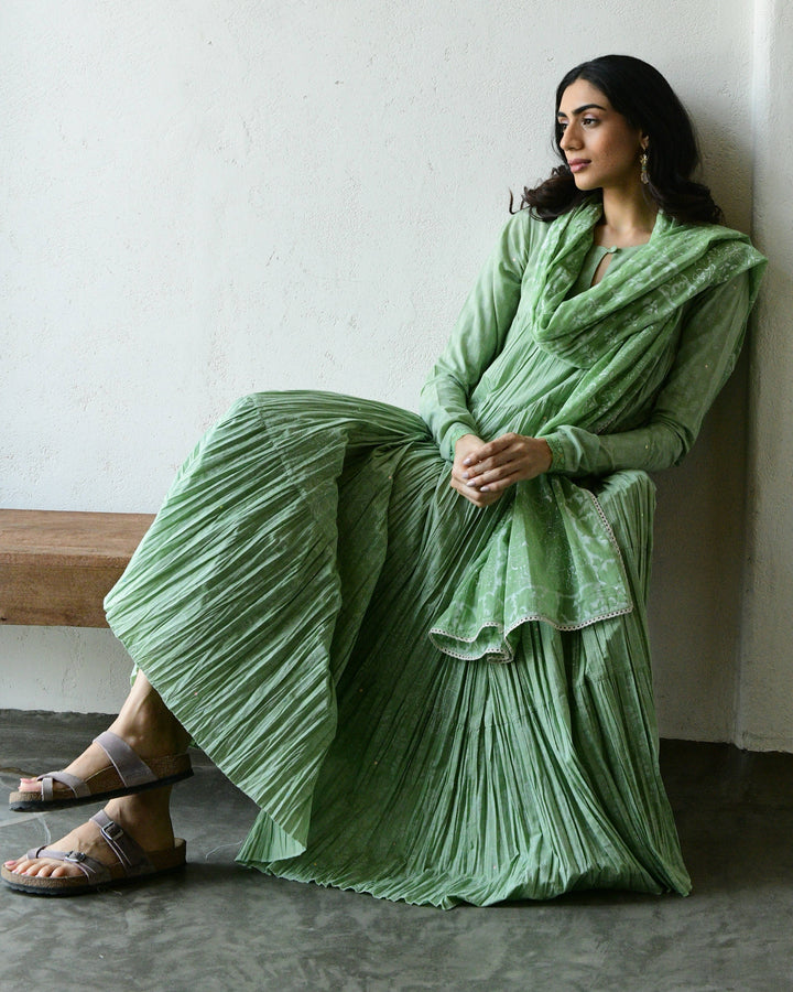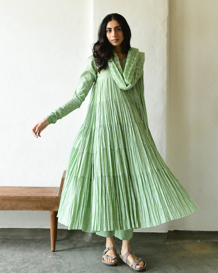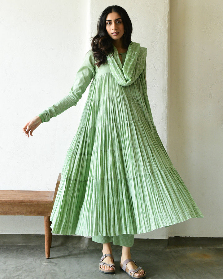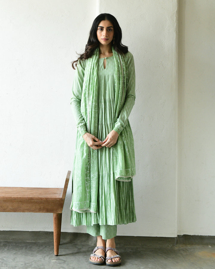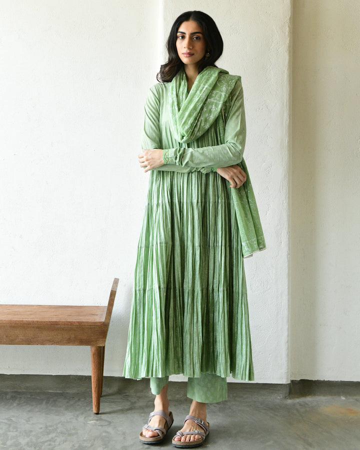 This three-piece set includes Anarkali, pants, and dupatta. Organic cotton khari hand block printed tier anarkali with lace detailing.Pants and mulmul dupatta in khari hand block printed