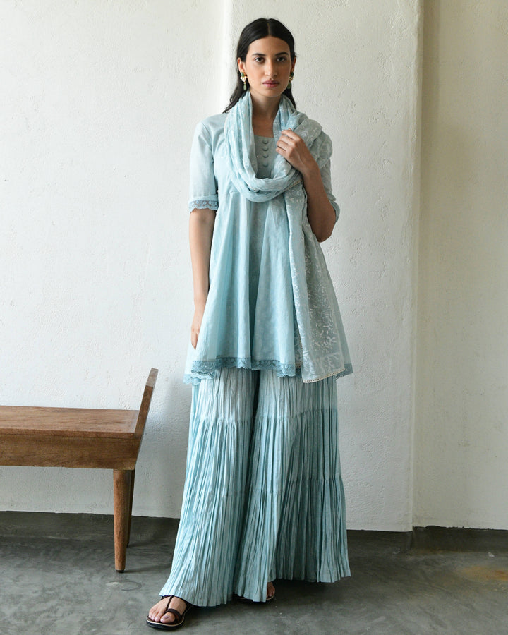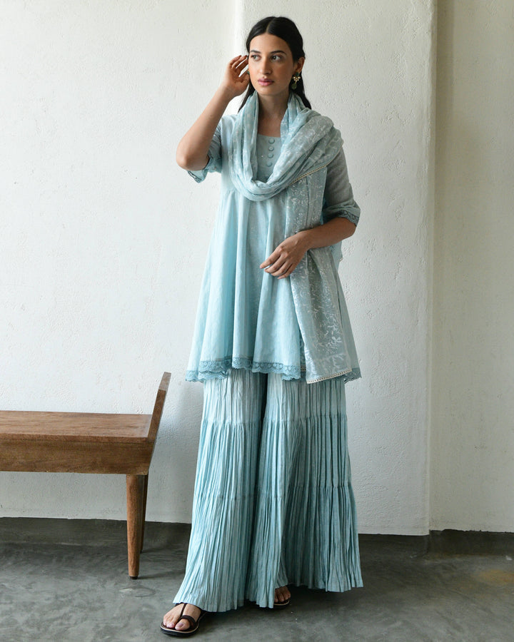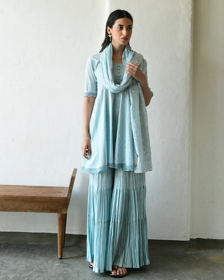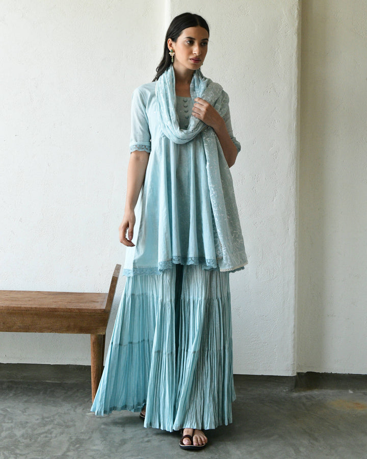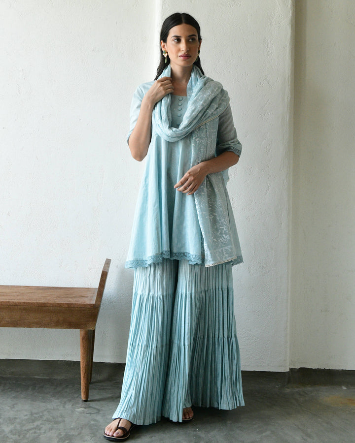 This three-piece set includes kurta, Sharara, and dupatta. Organic cotton khari hand block printed kurta with lace detailing. Sharara Pants and mulmul dupatta in khari hand block printed