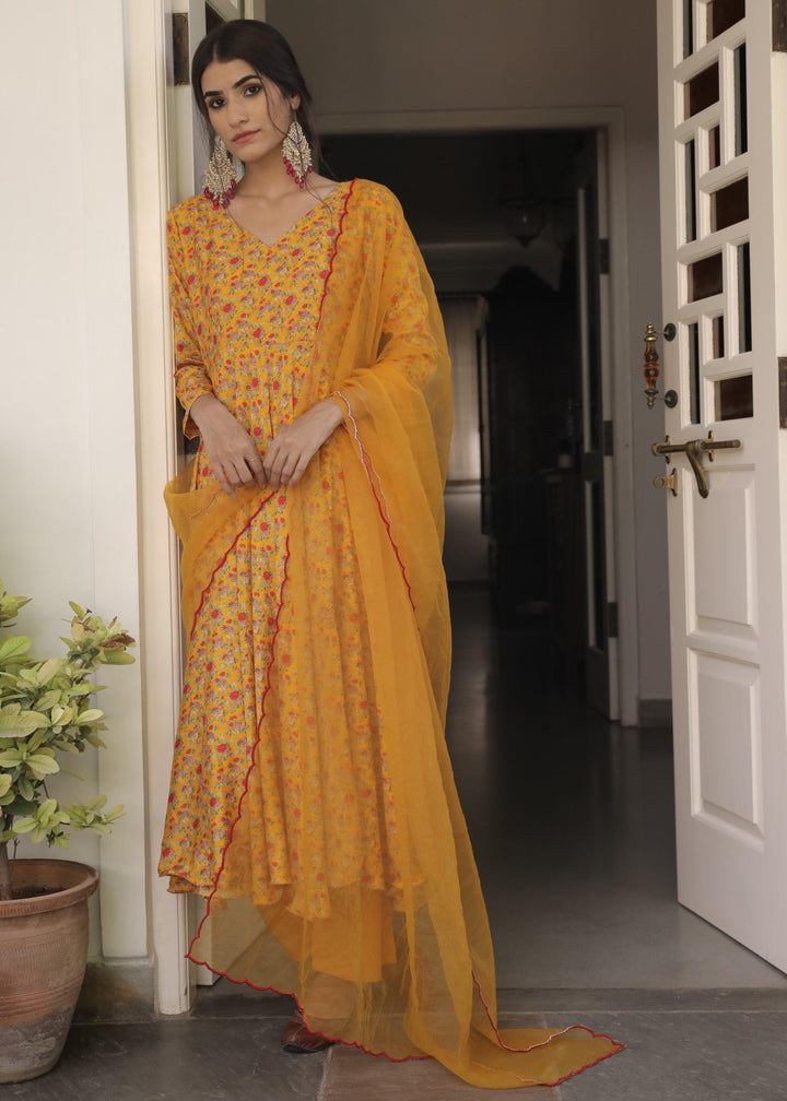This three-piece set includes Anarkali, pants, and a dupatta. Nargis anarkali in our classic printed Italian crepe with hand-work detailings. Italian crepe pants with an elasticated waist.Organza dupatta with hand-embroidered on the edges.