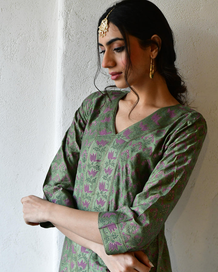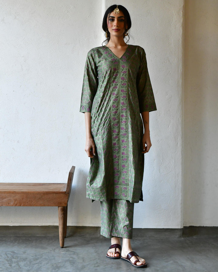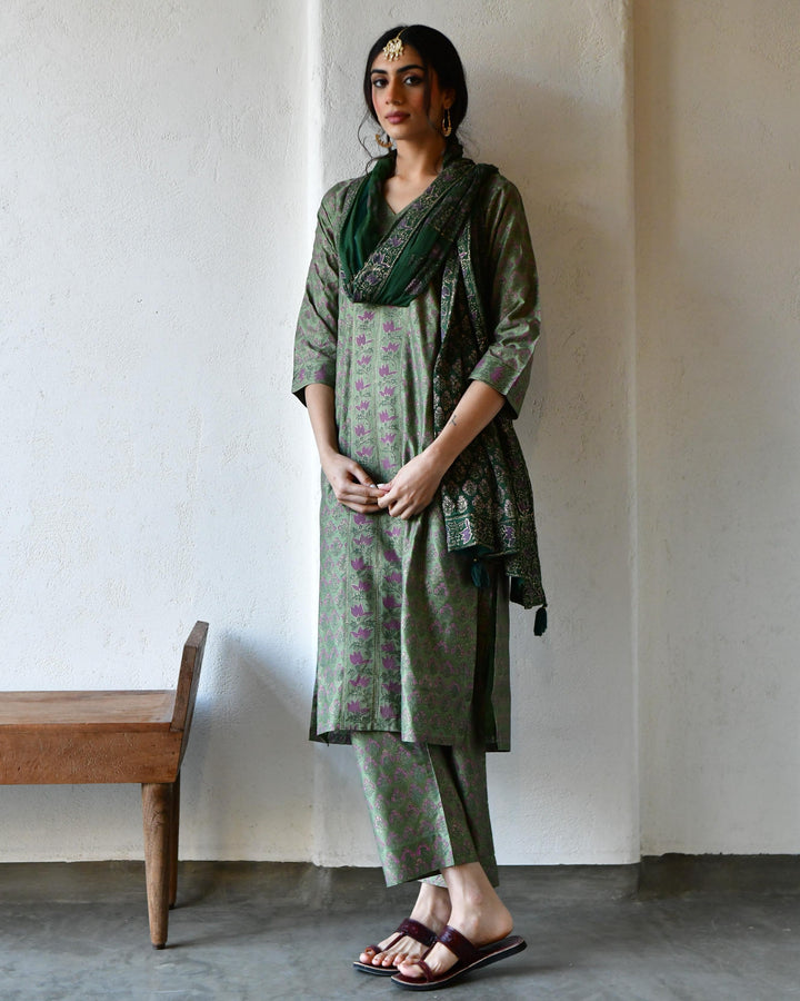 This three-piece set includes straight kurta, pants, and dupatta. Organic cotton green handblockprinted straight kurta with hand embroidery . Matching Pants in Organic cotton and organic mulmul handblockprinted dupatta.