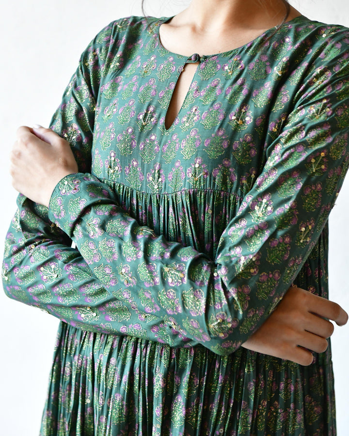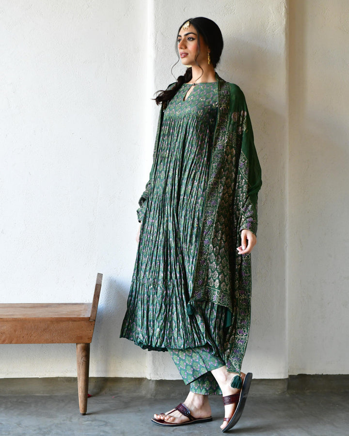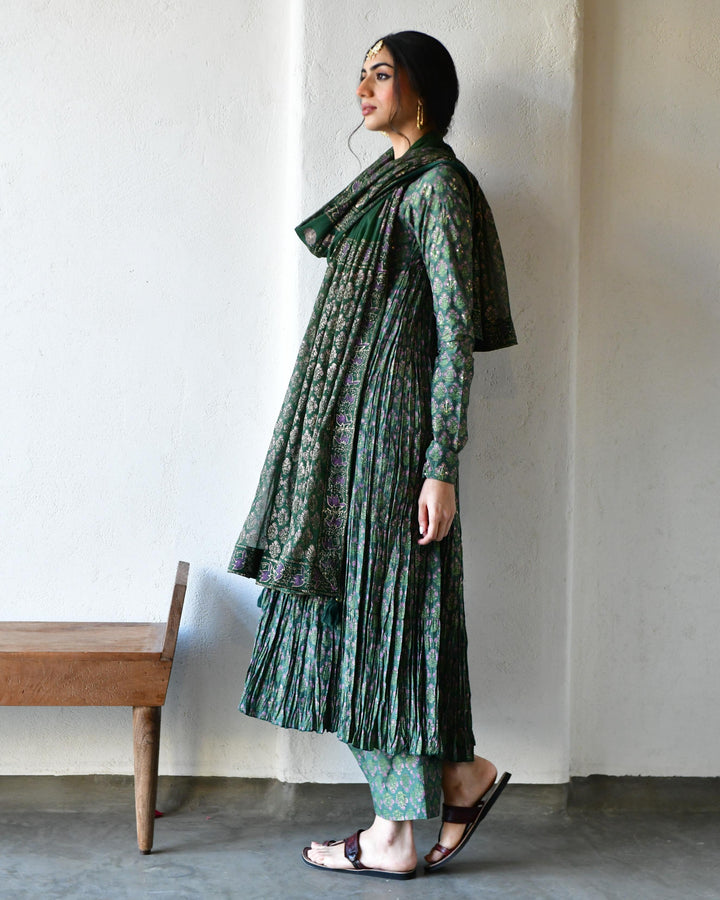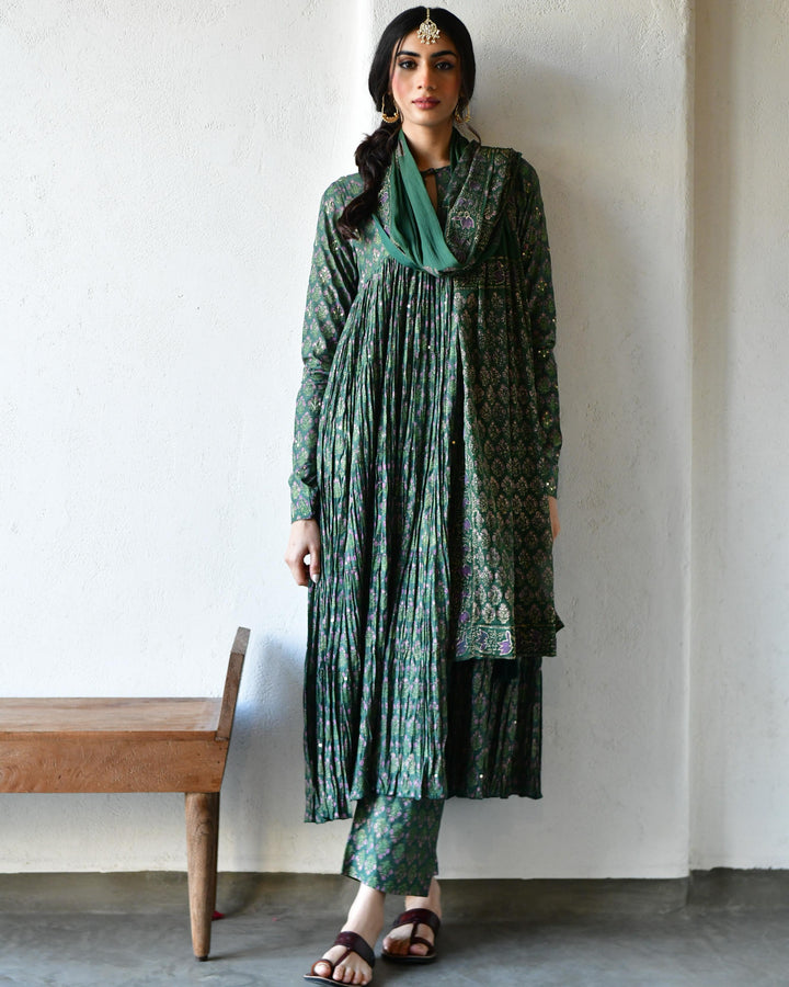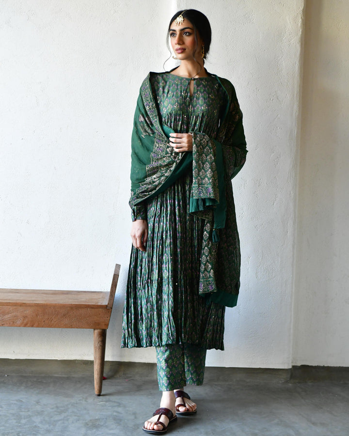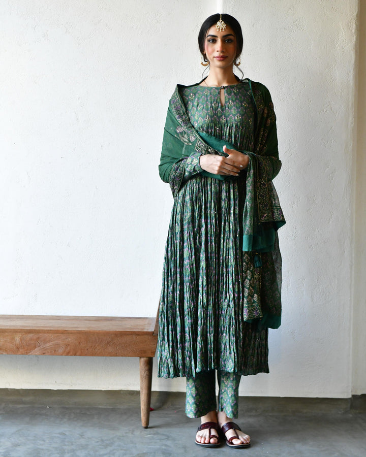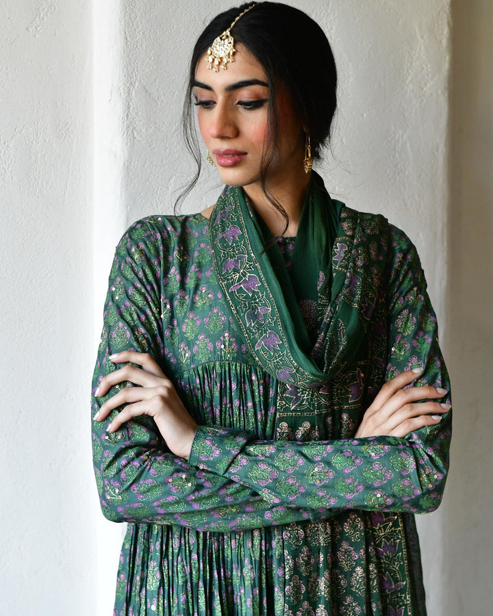 This three-piece set includes tier Anarkali, pants, and dupatta. Organic cotton green handblockprinted tier anarkali with hand embroidery . Matching Pants in Organic cotton and organic mulmul handblockprinted dupatta.