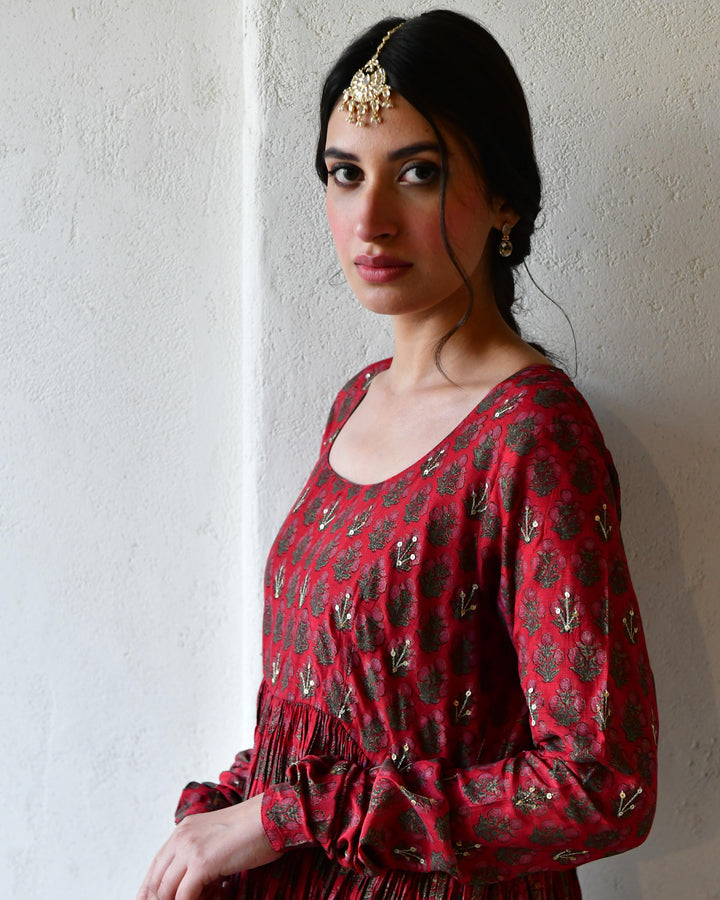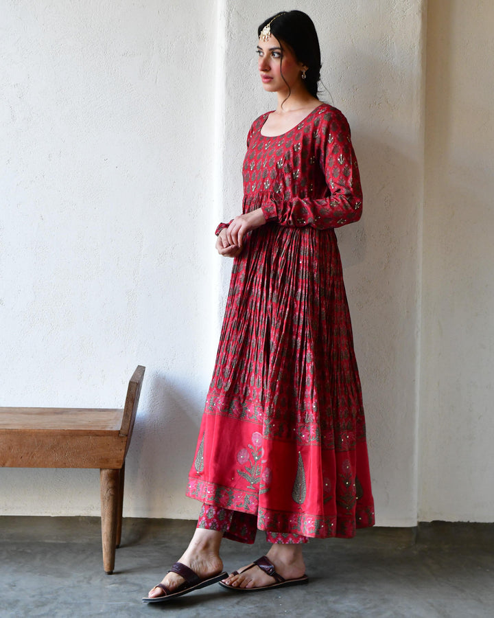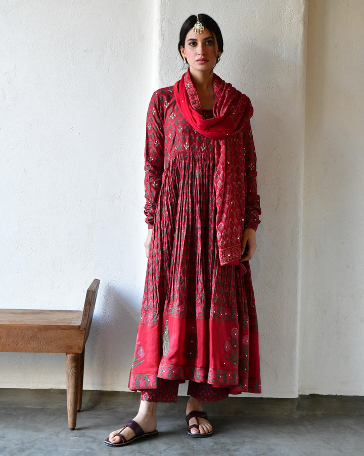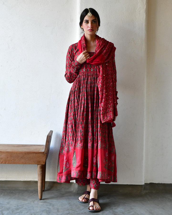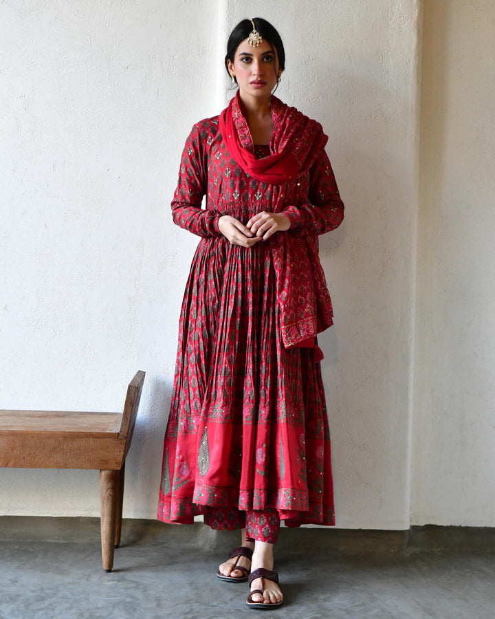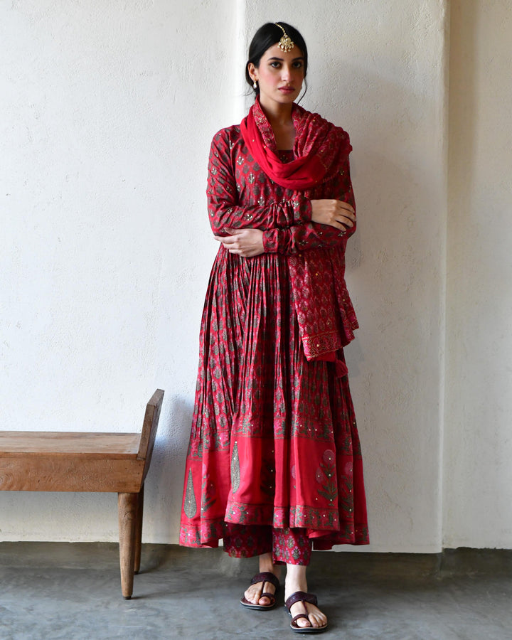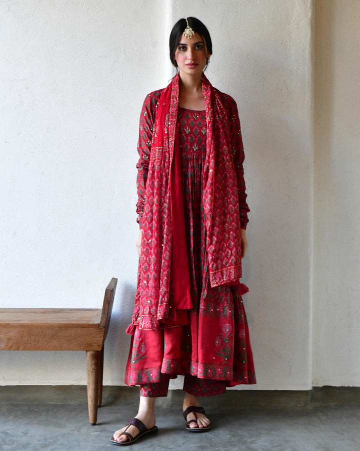 This three-piece set includes Anarkali, pants, and dupatta. Organic cotton Red handblockprinted anarkali with hand embroidery . Matching Pants in Organic cotton and organic mulmul handblockprinted dupatta.