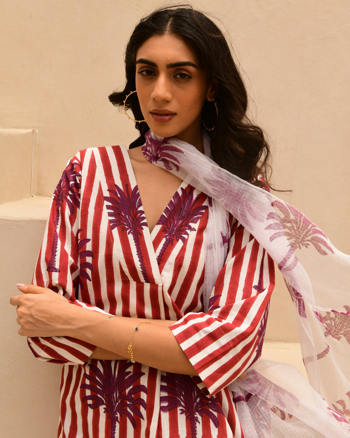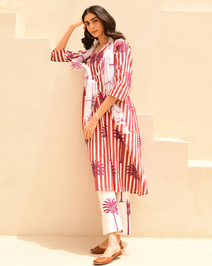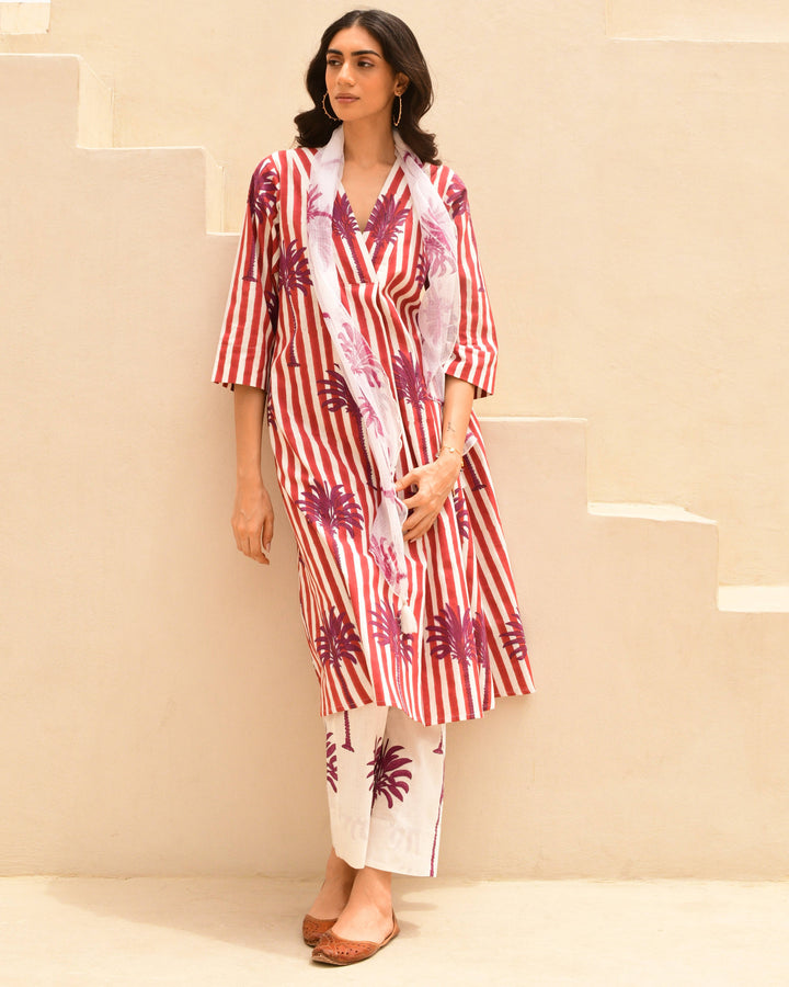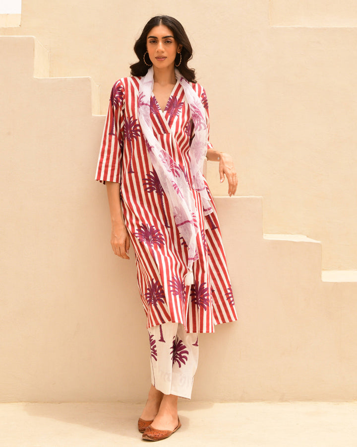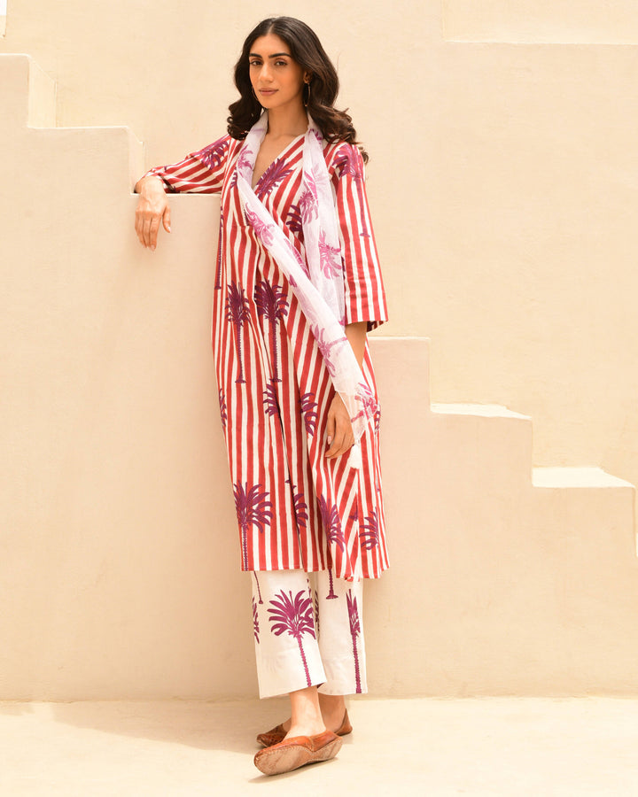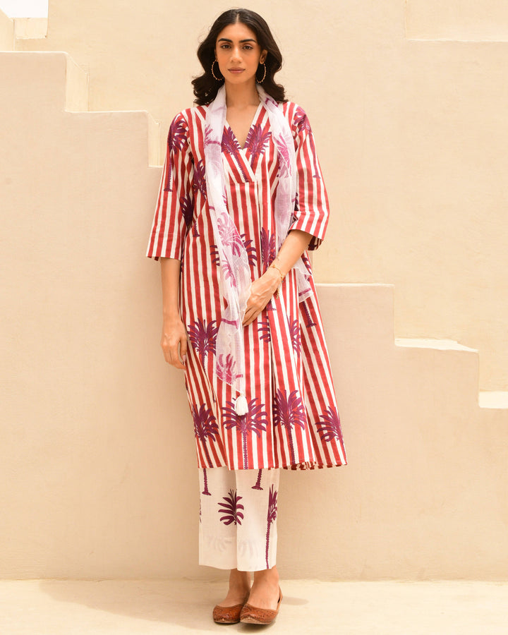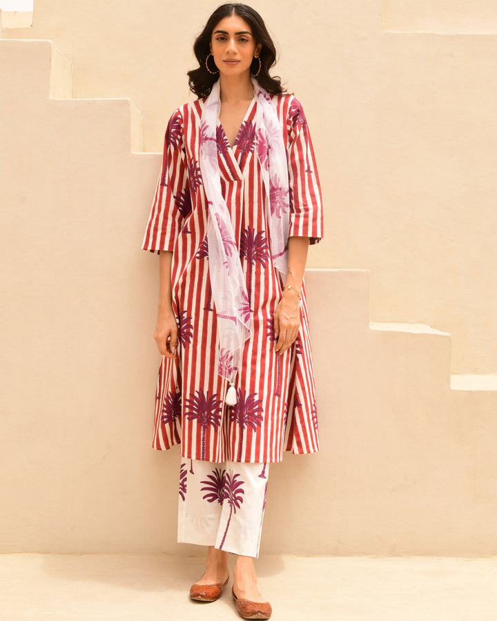 Red stripes and palm handblockprinted A-line kurta set of 3