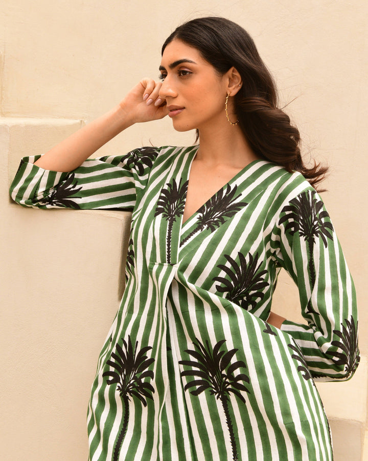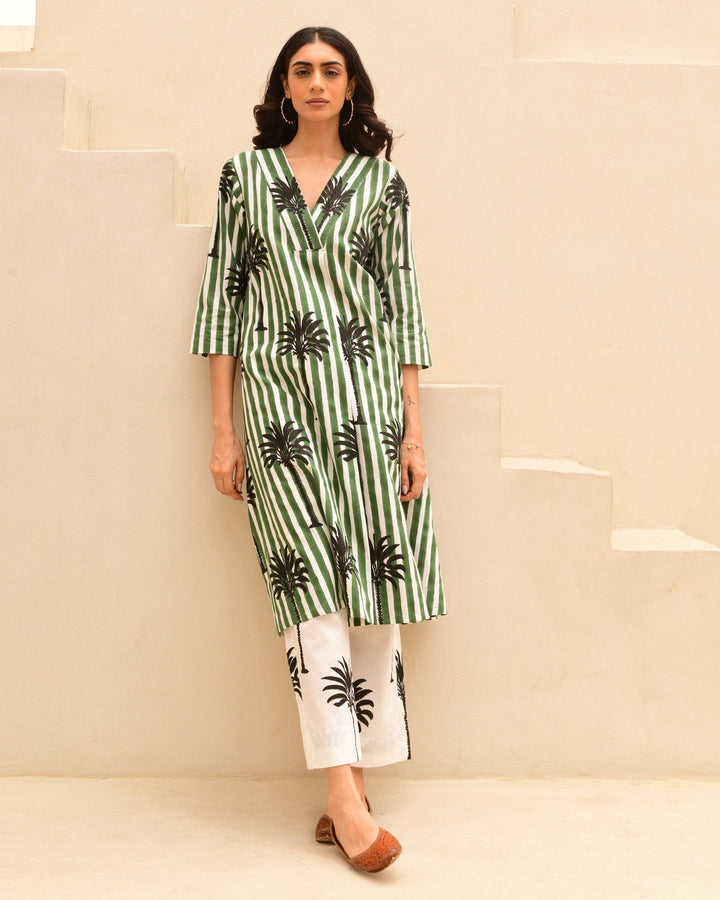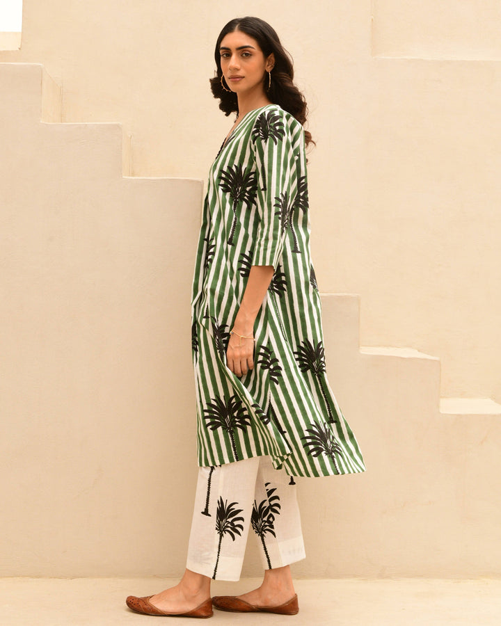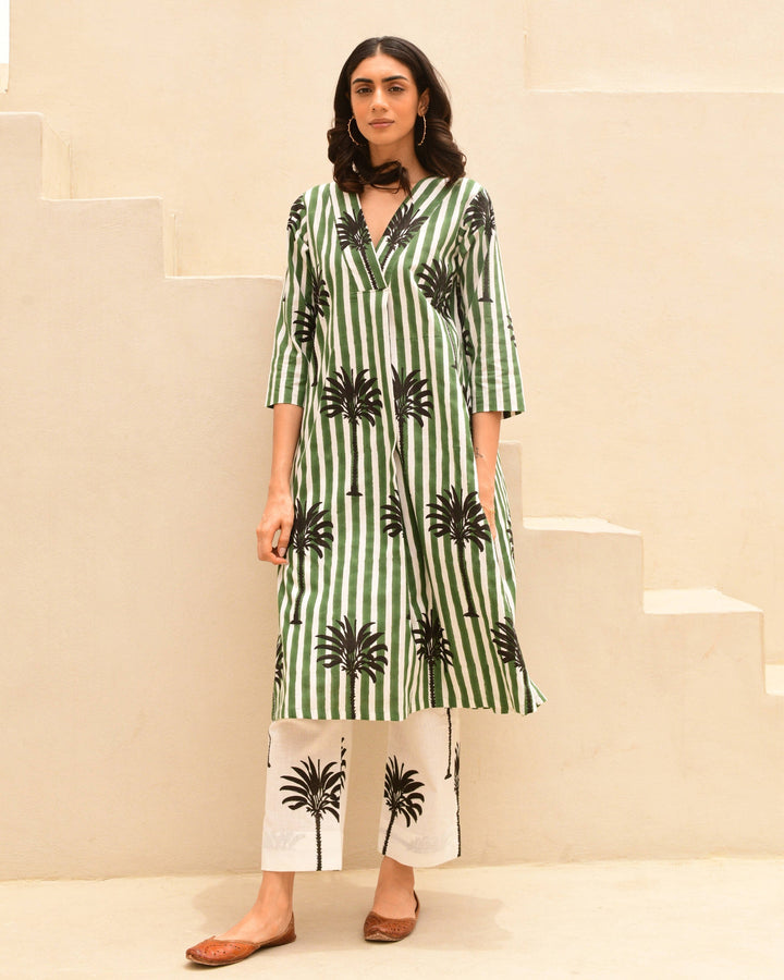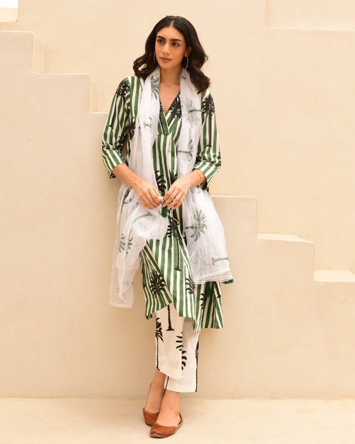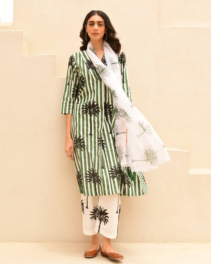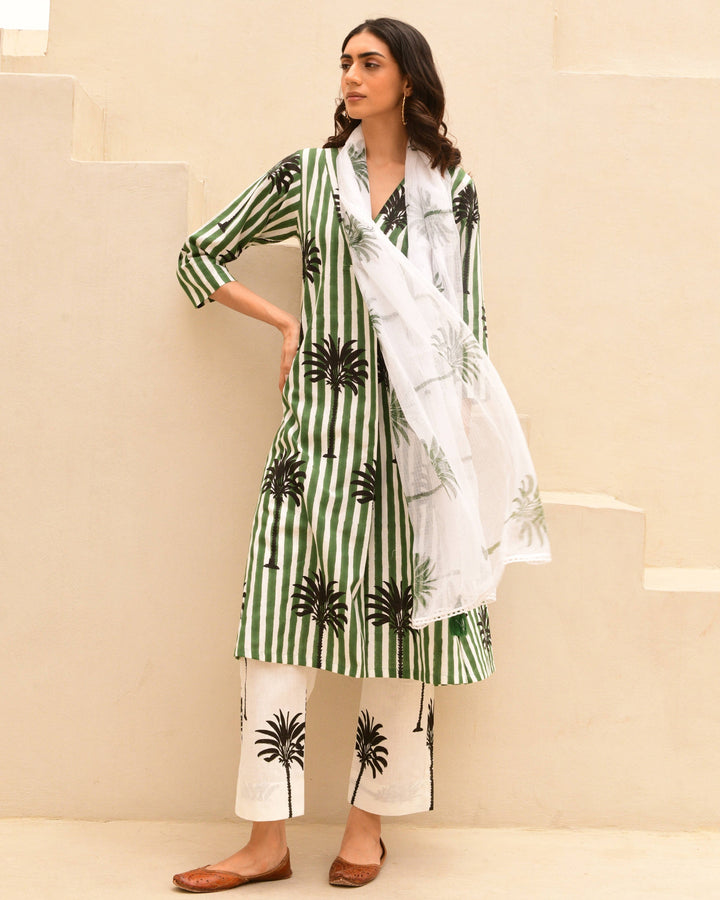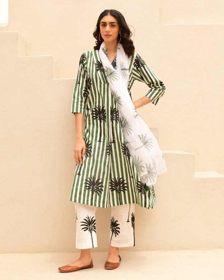 Green stripes and palm handblockprinted A-line kurta set of 3