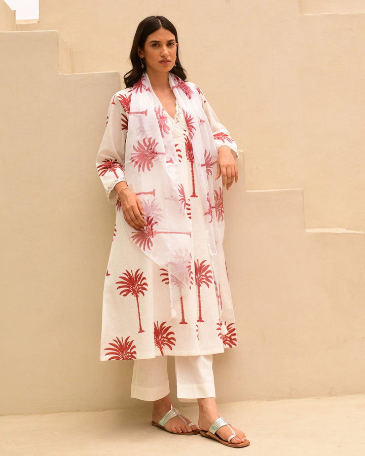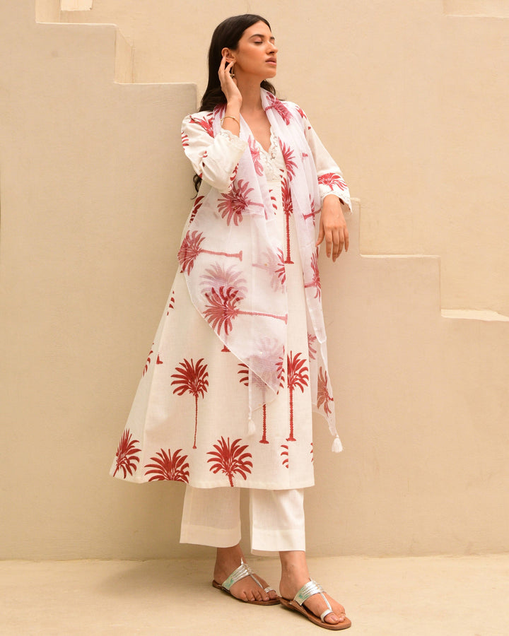 This three-piece set includes a kurta, pants, and a dupatta.High-quality handblockprinted organic cotton Kurta and matching pants with less detailing. Doria dupatta with hand working gotta detailing.