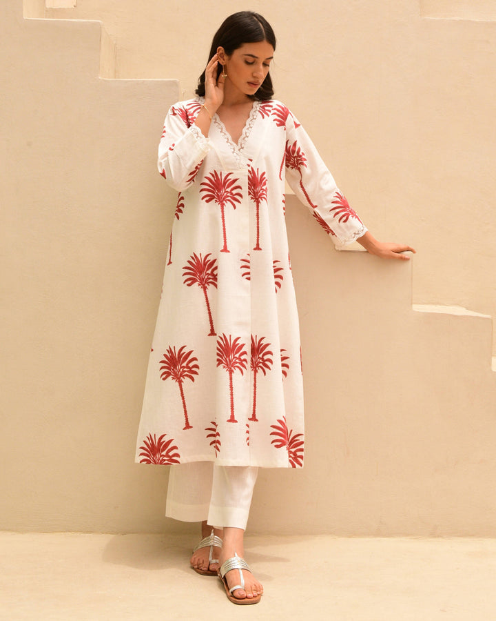 COTTON PALMS - Escape to a tropical paradise this summer with our handblock-printed palm trees on organic cotton. Soft, breathable, and effortlessly chic, these timeless pieces transport you to a haven of serenity and elegance, perfect for warm weather escapades.".