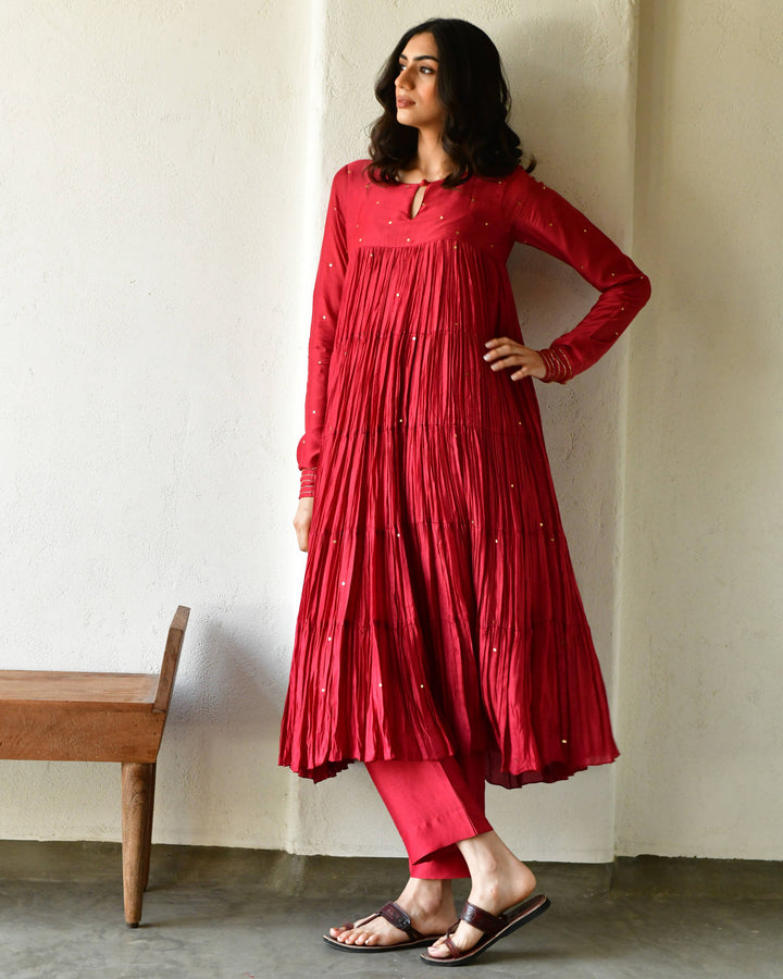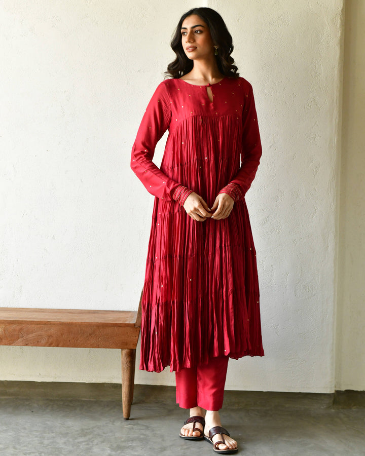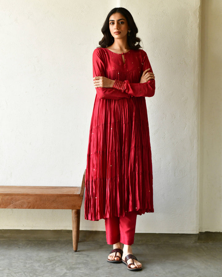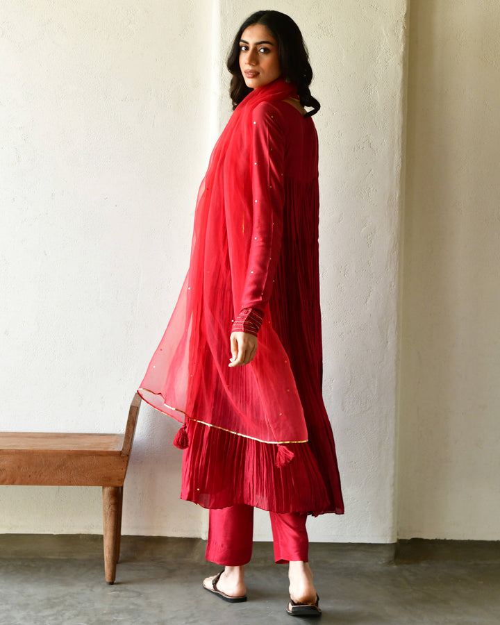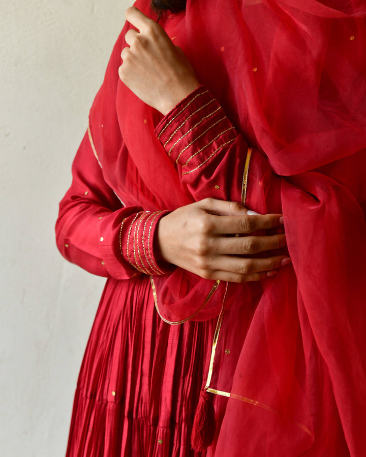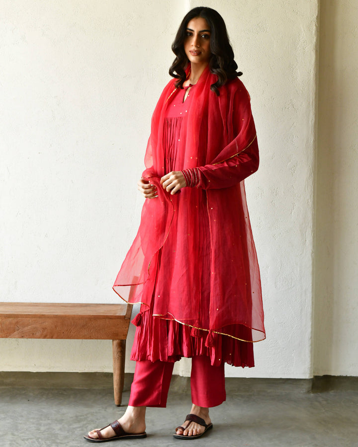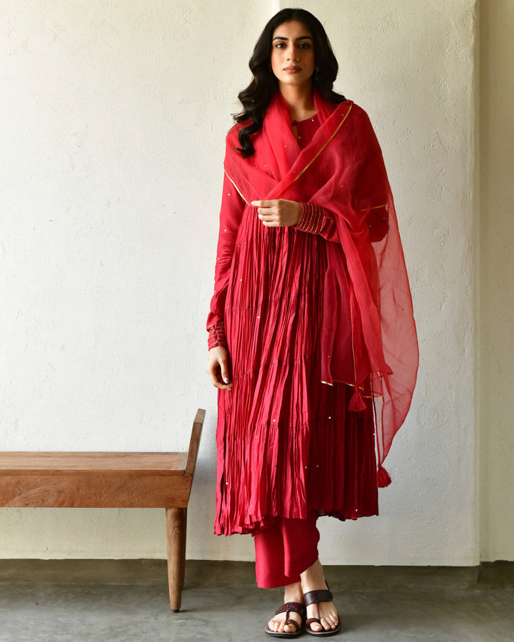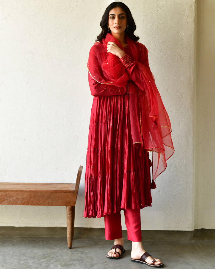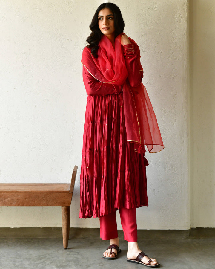 This three-piece set includes tier Anarkali, pants, and dupatta. Modal crimson red tier anarkali with handwork detailing.Matching Pants in modal and soft organza dupatta.