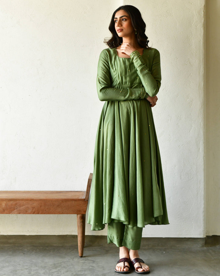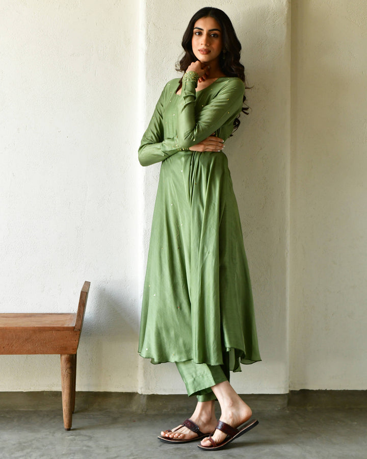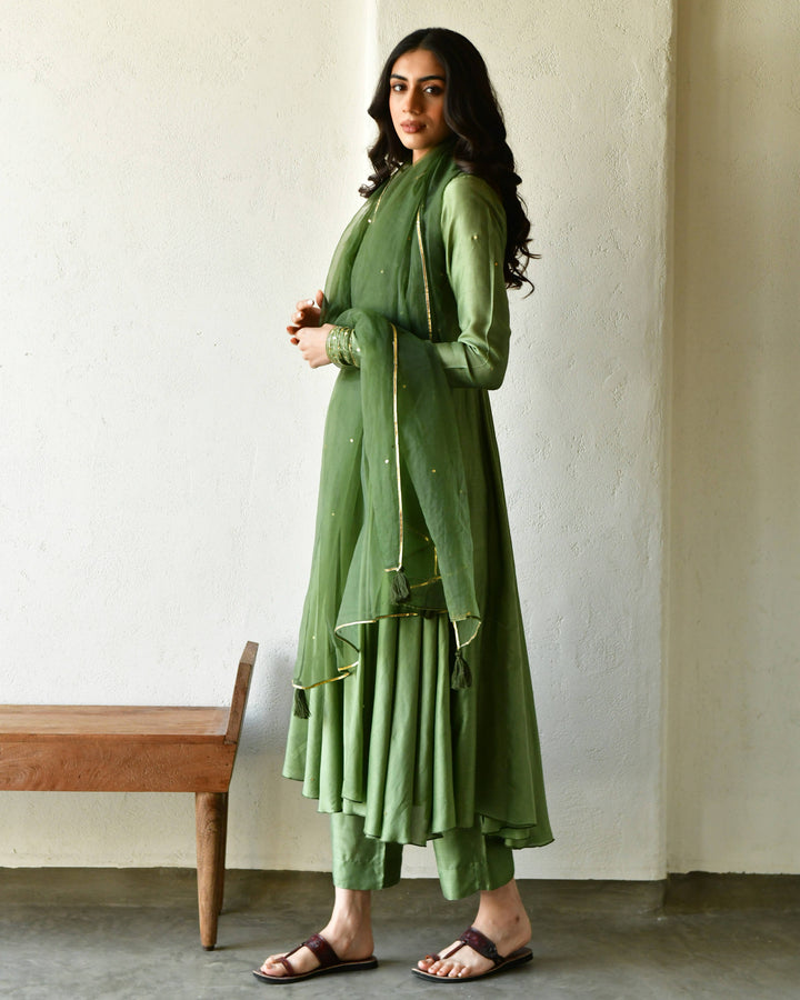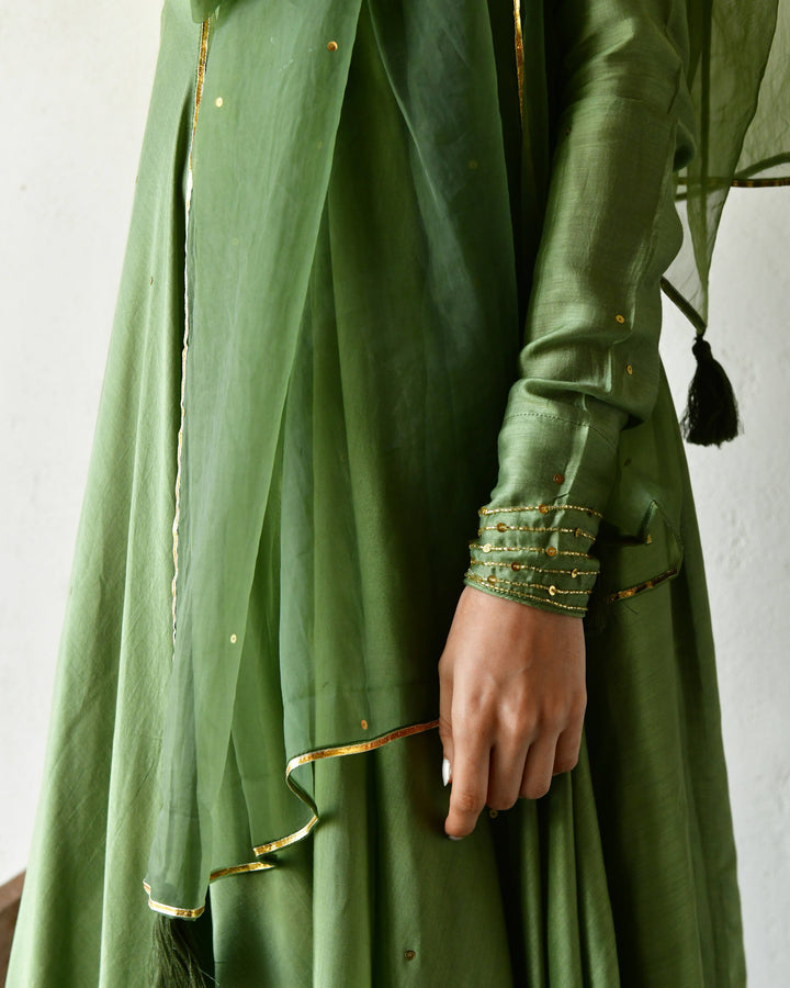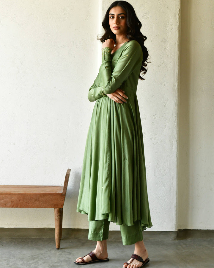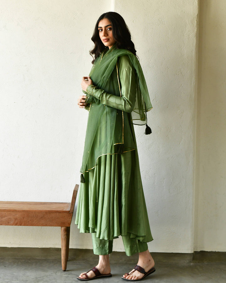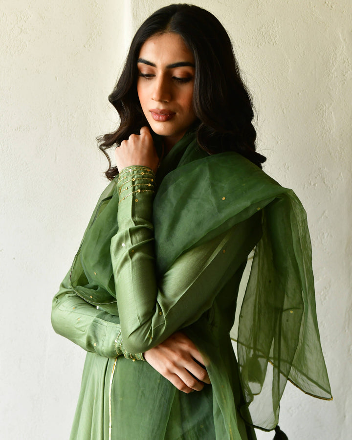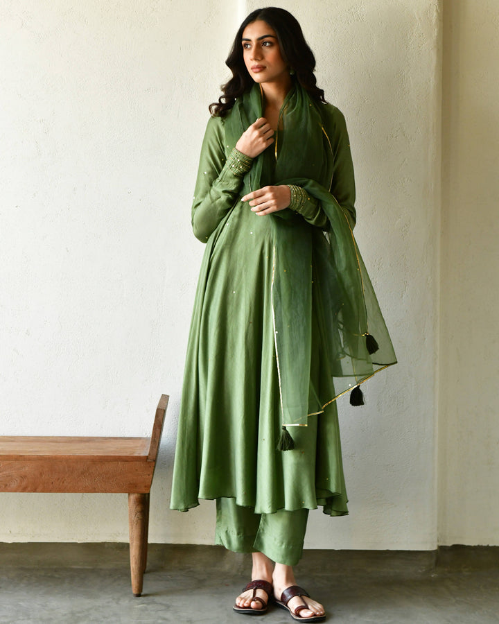 This three-piece set includes Anarkali, pants, and dupatta. Modal fern green anarkali with handwork detailing.Matching Pants in modal and soft organza dupatta.