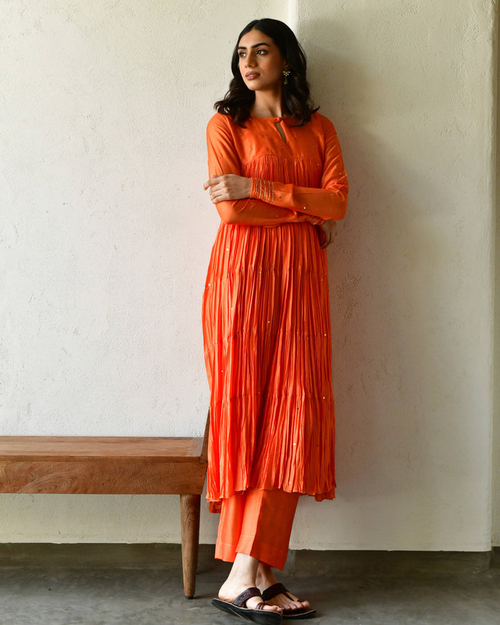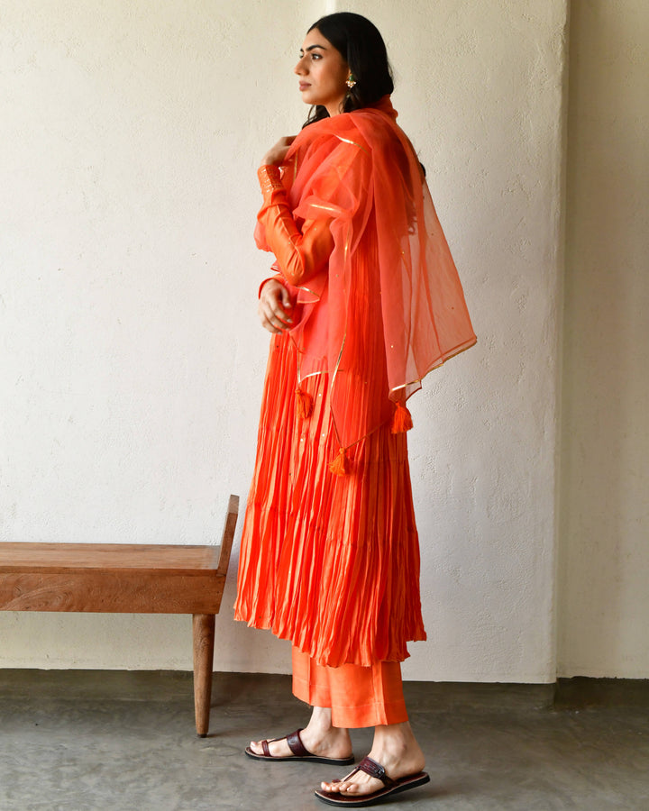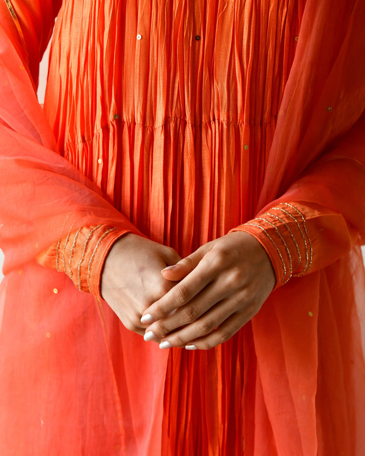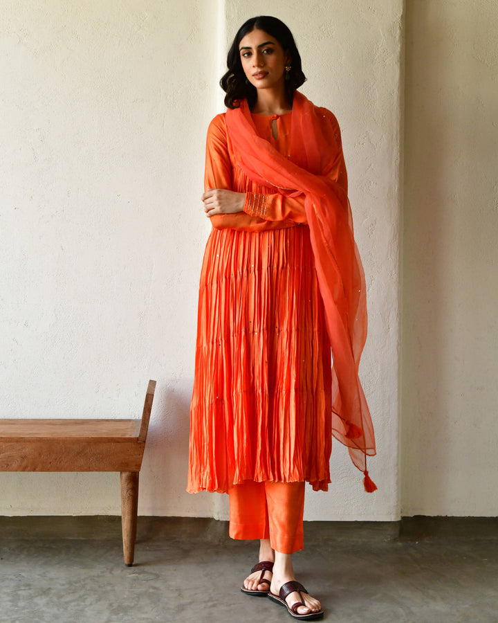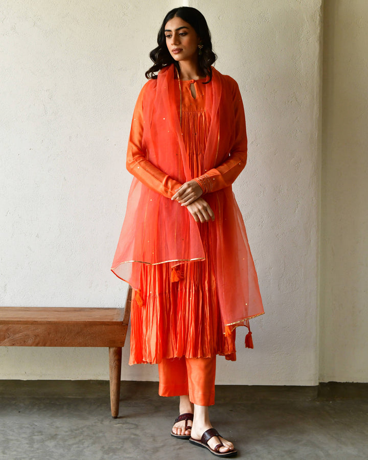 This three-piece set includes tier Anarkali, pants, and dupatta. Modal rust orange tier anarkali with handwork detailing.Matching Pants in modal and soft organza dupatta.
