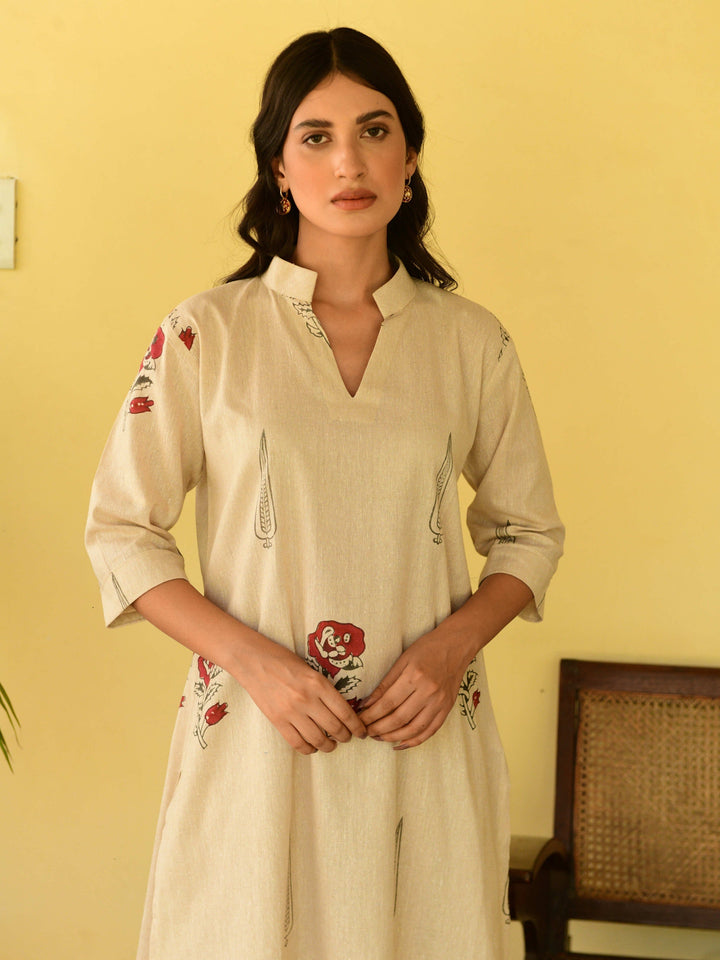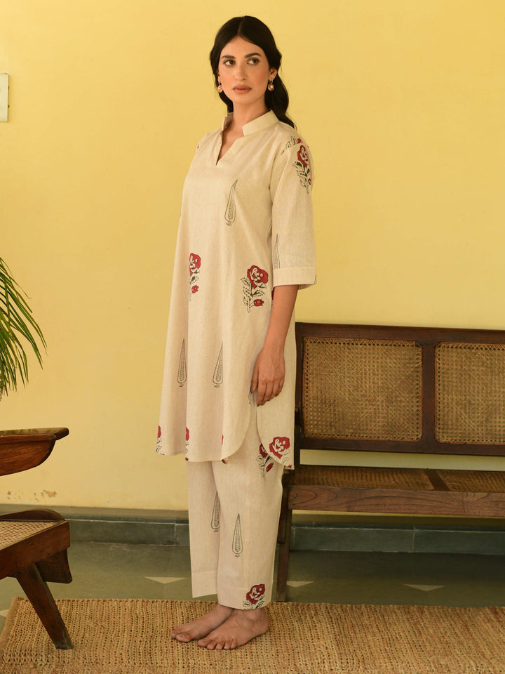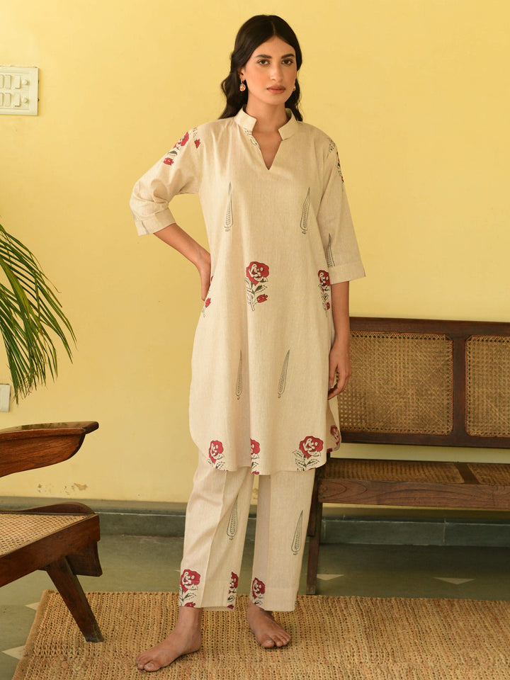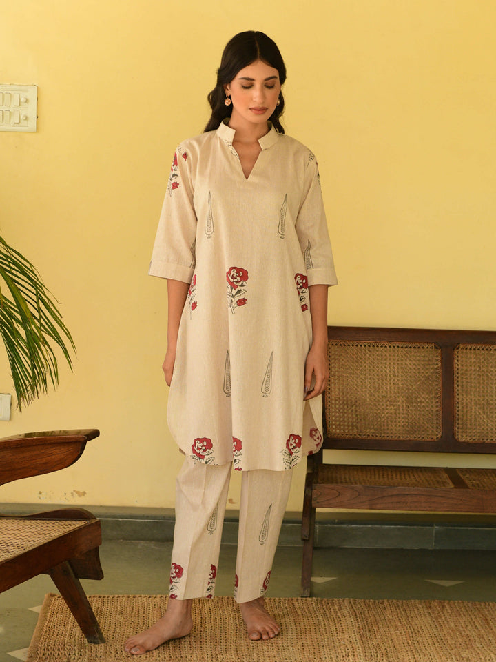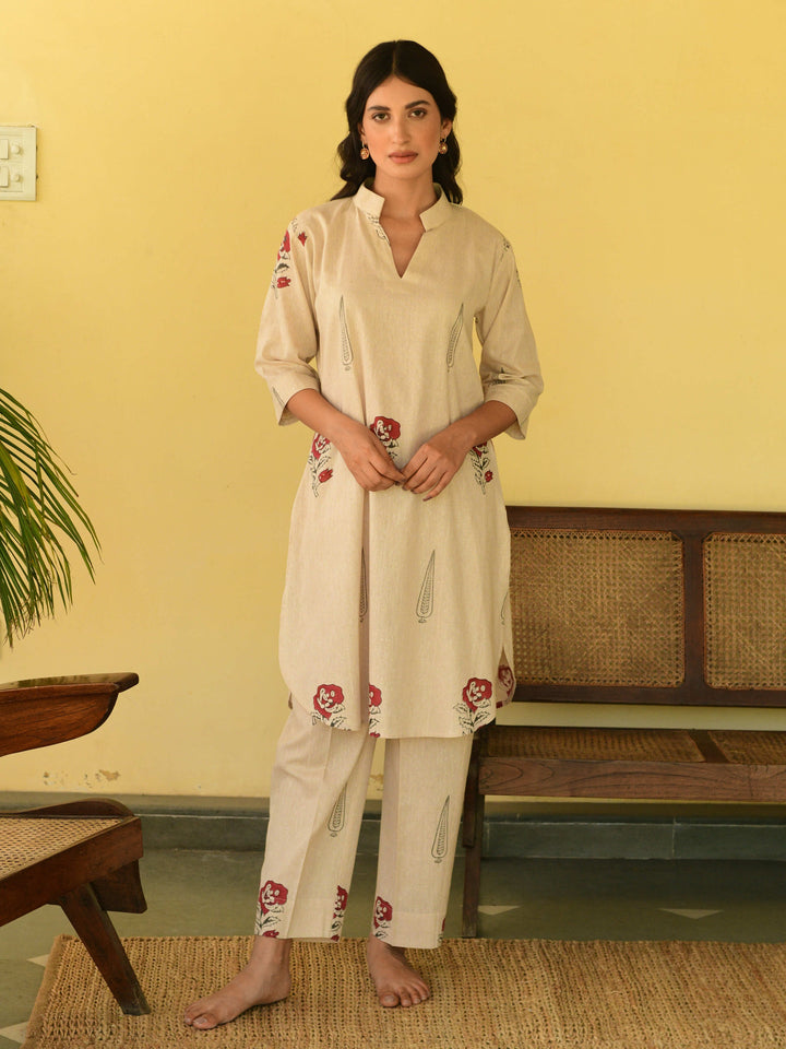 This three-piece set includes straight short kurta and pants. South cotton block printed straight short kurta with handwork detailing. Pants has elasticated waist.