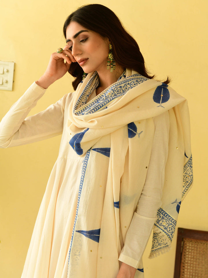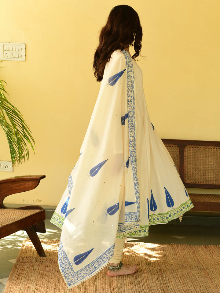 This three-piece set includes Anarkali, churidar, and dupatta. Mulmul cotton block printed anarkali with handwork detailing. Churidar and handblock printed mulmul dupatta with hand-work detailing.