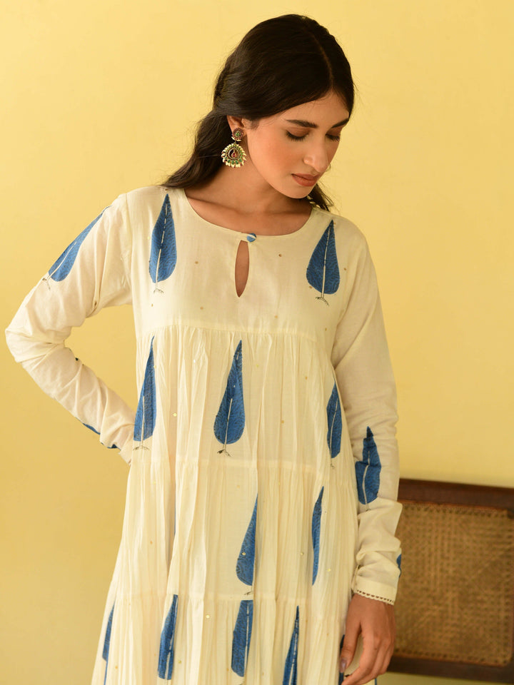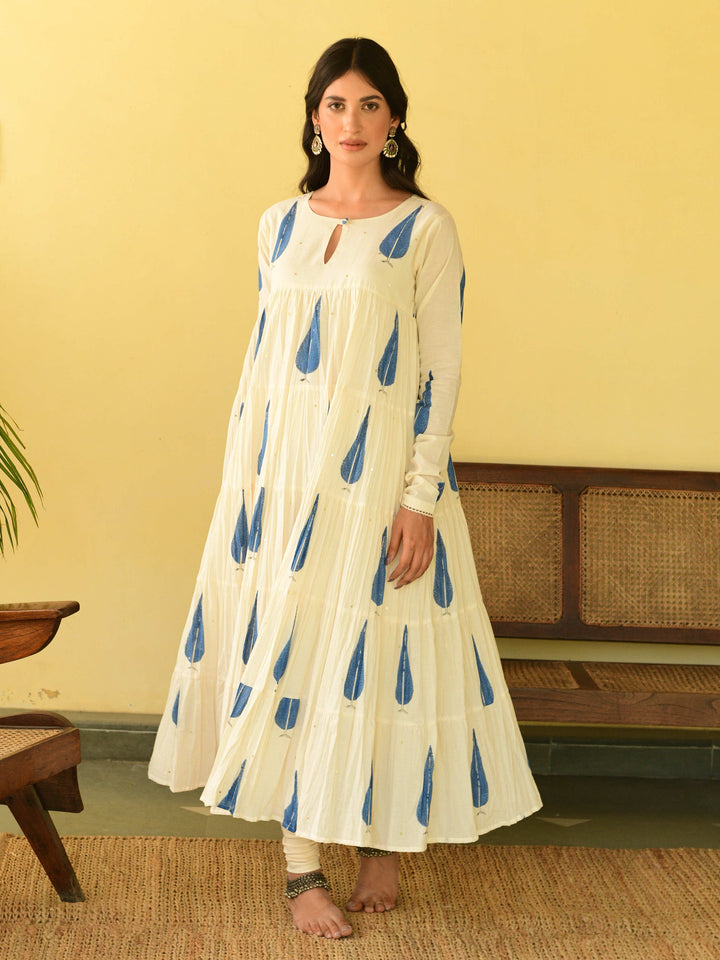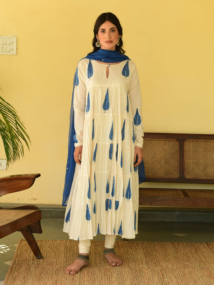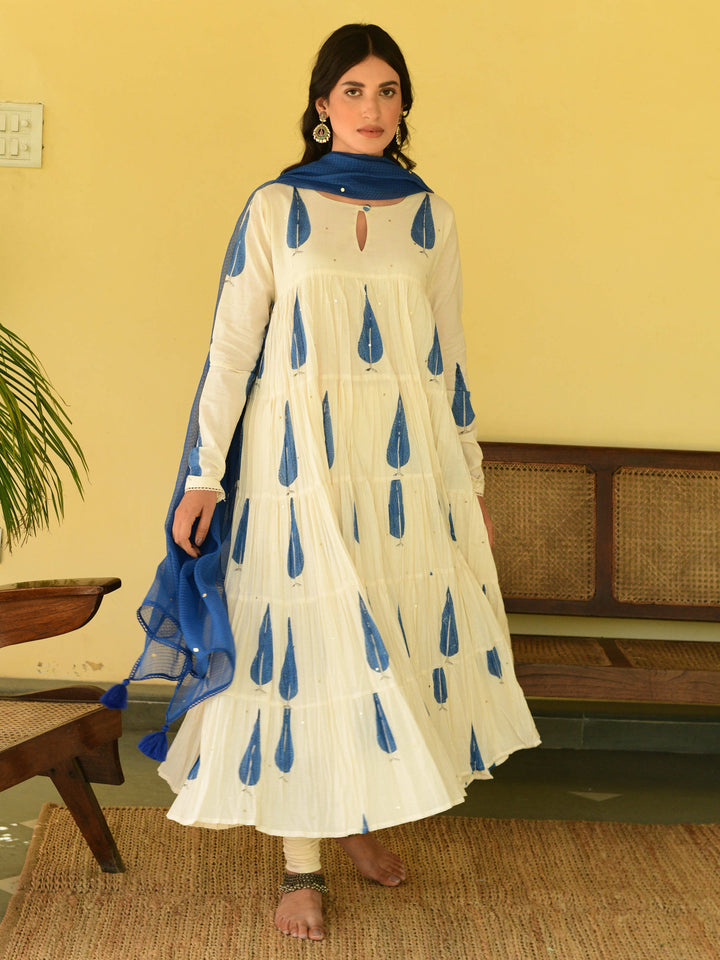 This three-piece set includes Anarkali, churidar, and dupatta. Mulmul cotton block printed tiered anarkali with handwork detailing. Churidar and kota doria dupatta with hand-work detailing.