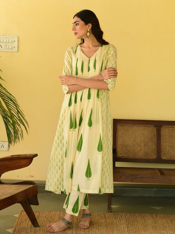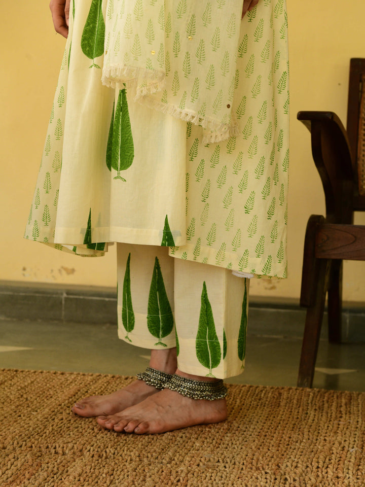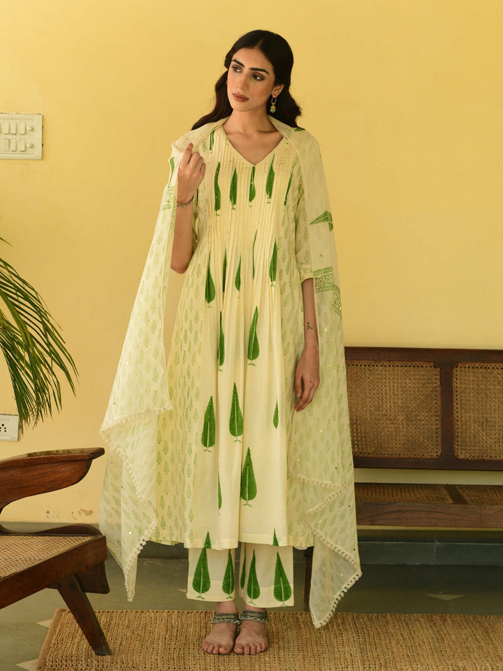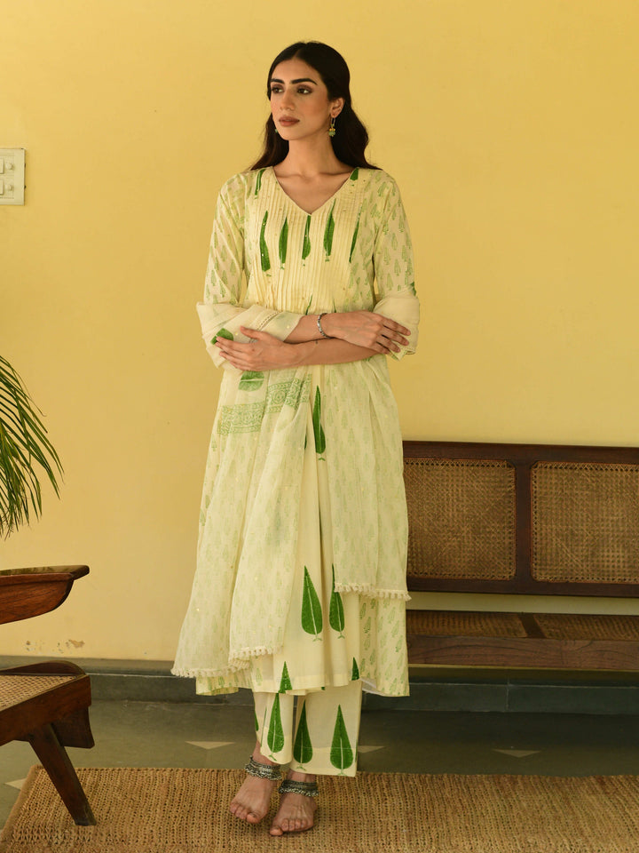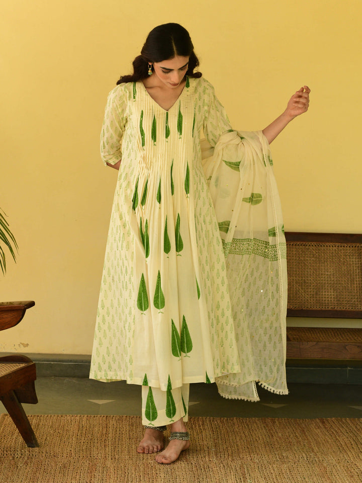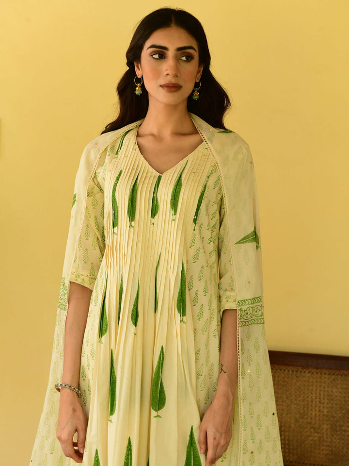 This three-piece set includes Pintuck anarkali, pants, and dupatta. Mulmul cotton block printed pintuck anarkali with handwork detailing. Pants has elasticated waist and Mulmul cotton handblock printed dupatta with hand-work detailing.