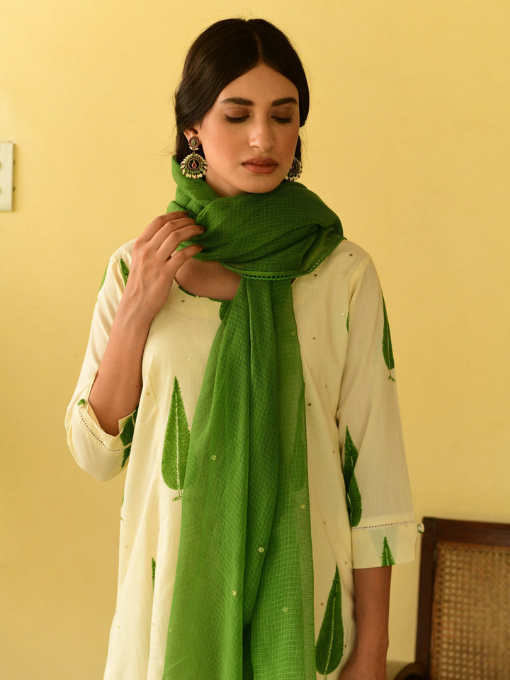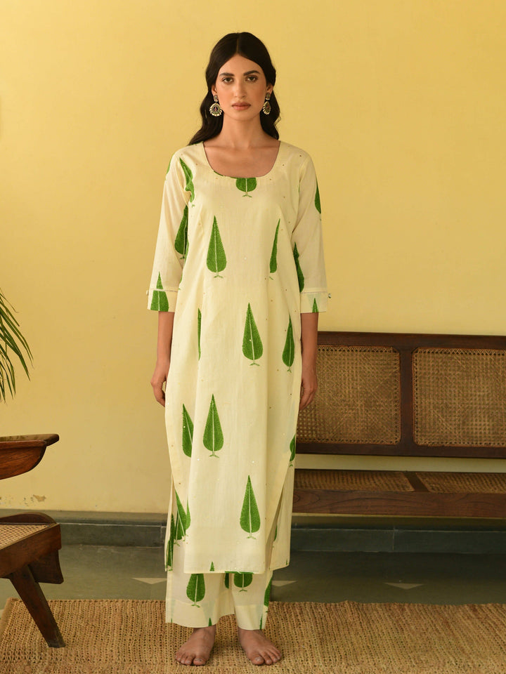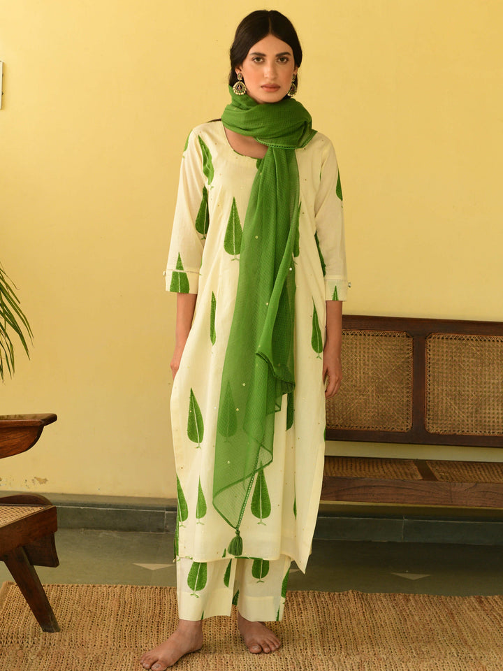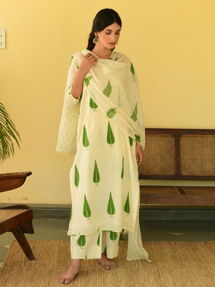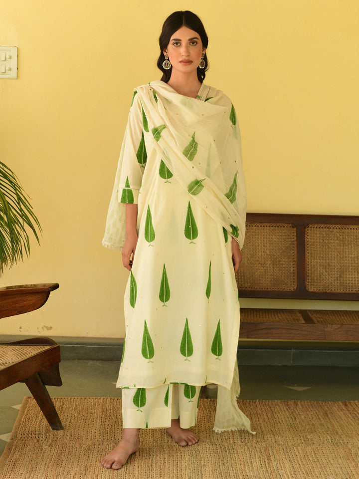 This three-piece set includes straight kurta, pants, and dupatta. Mulmul cotton block printed straight kurta with handwork detailing. Pants has elasticated waist and Mulmul cotton handblock printed dupatta with hand-work detailing.
