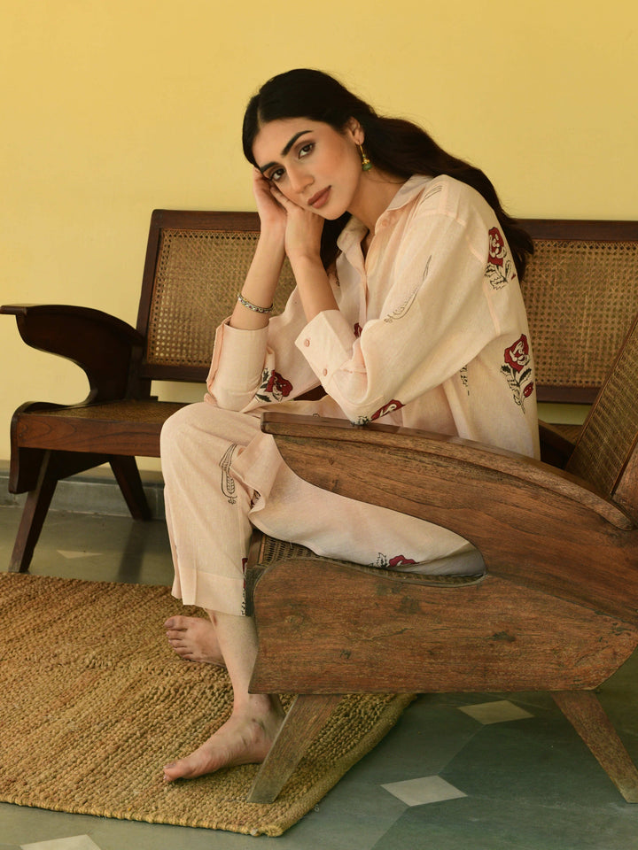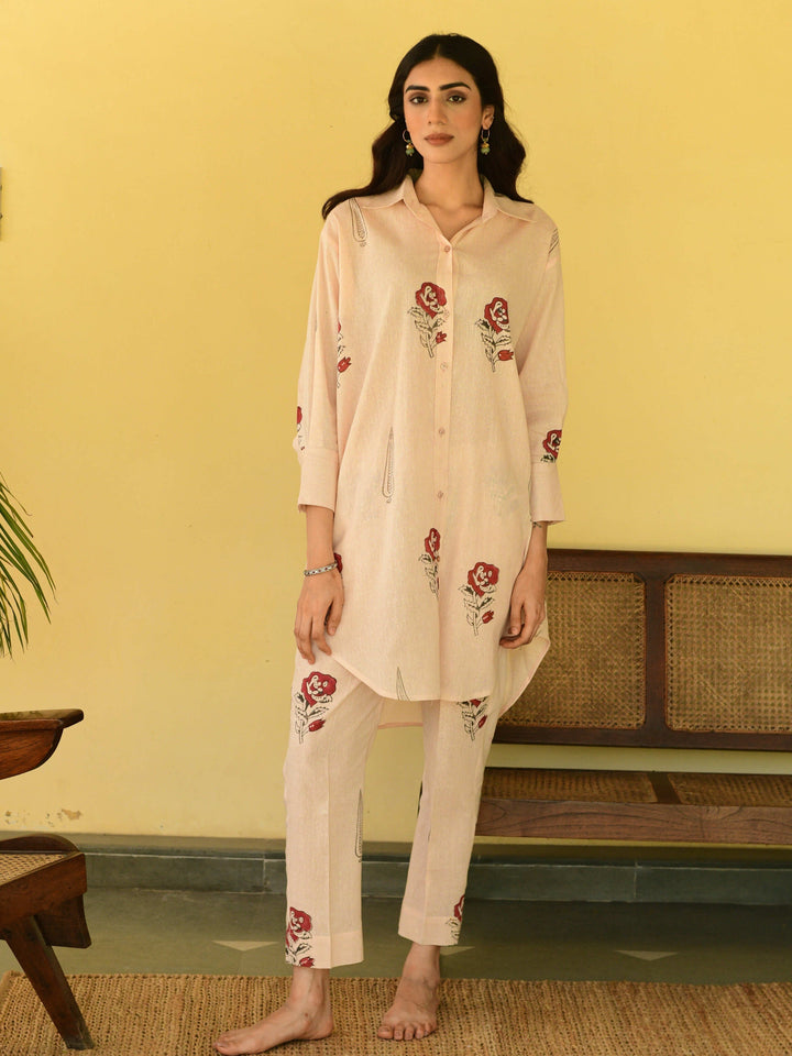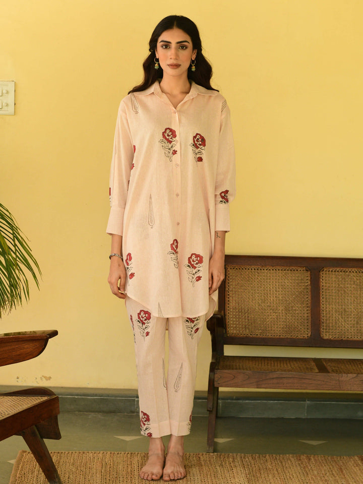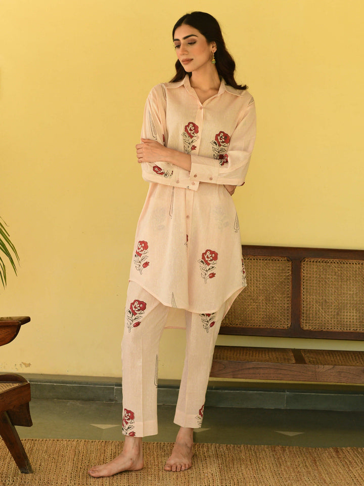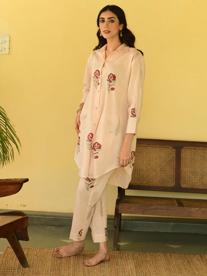 This three-piece set includes a straight short kurta and pants. South cotton block printed straight short kurta with handwork detailing. Pants has elasticated waist .