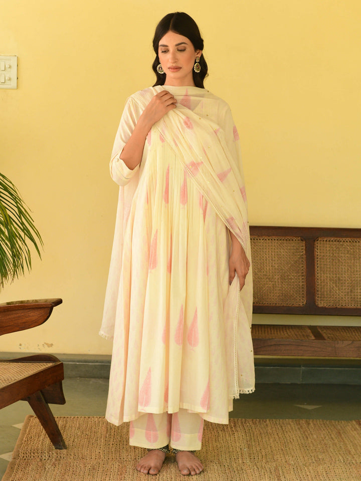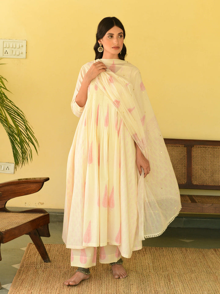 This three-piece set includes Pintuck anarkali, pants, and dupatta. Mulmul cotton block printed pintuck anarkali with handwork detailing. Pants has elasticated waist and Mulmul cotton handblock printed dupatta with hand-work detailing.