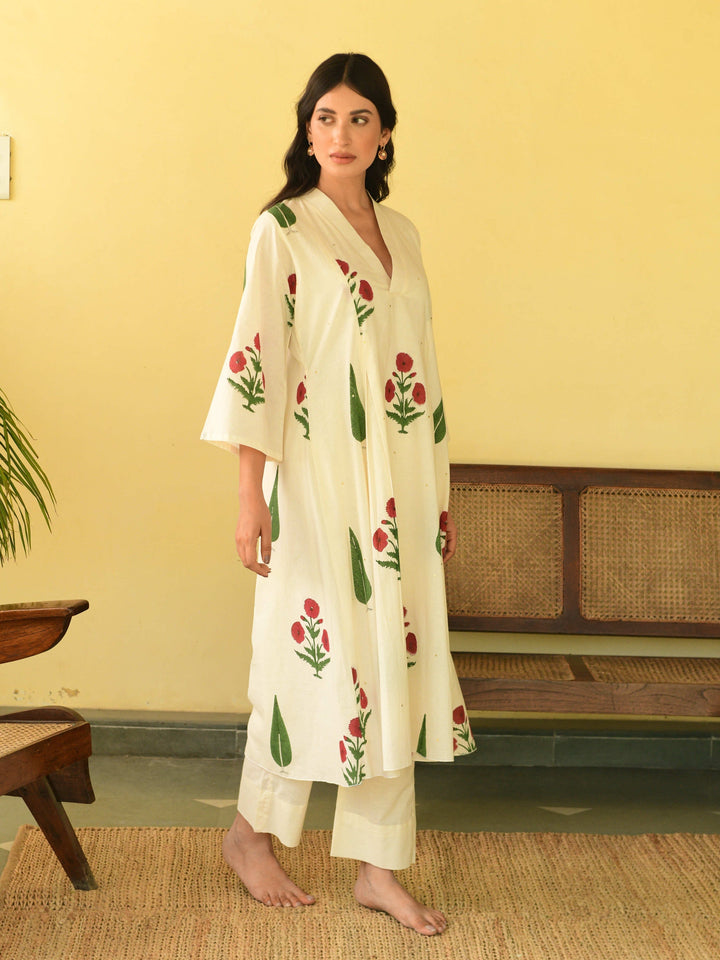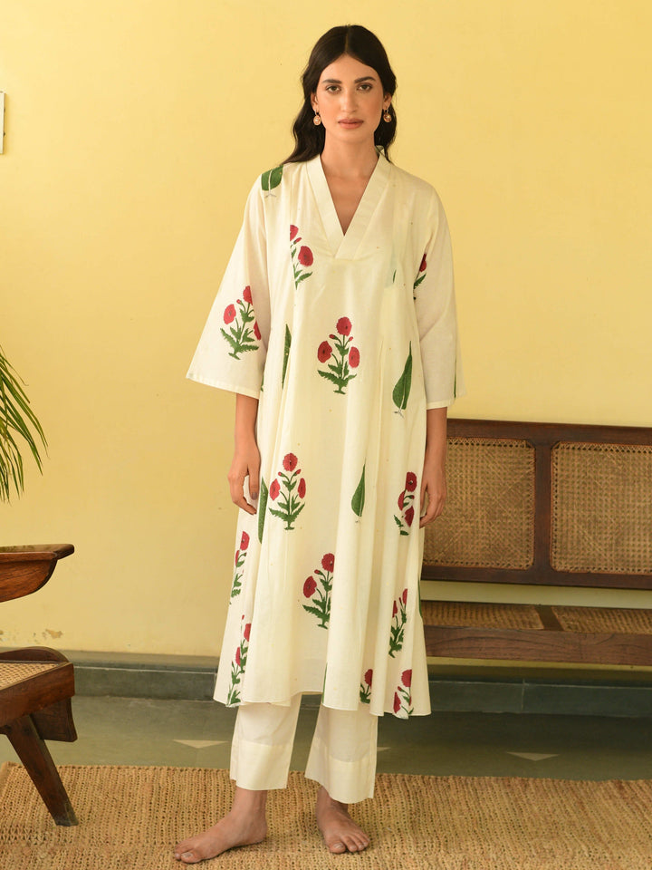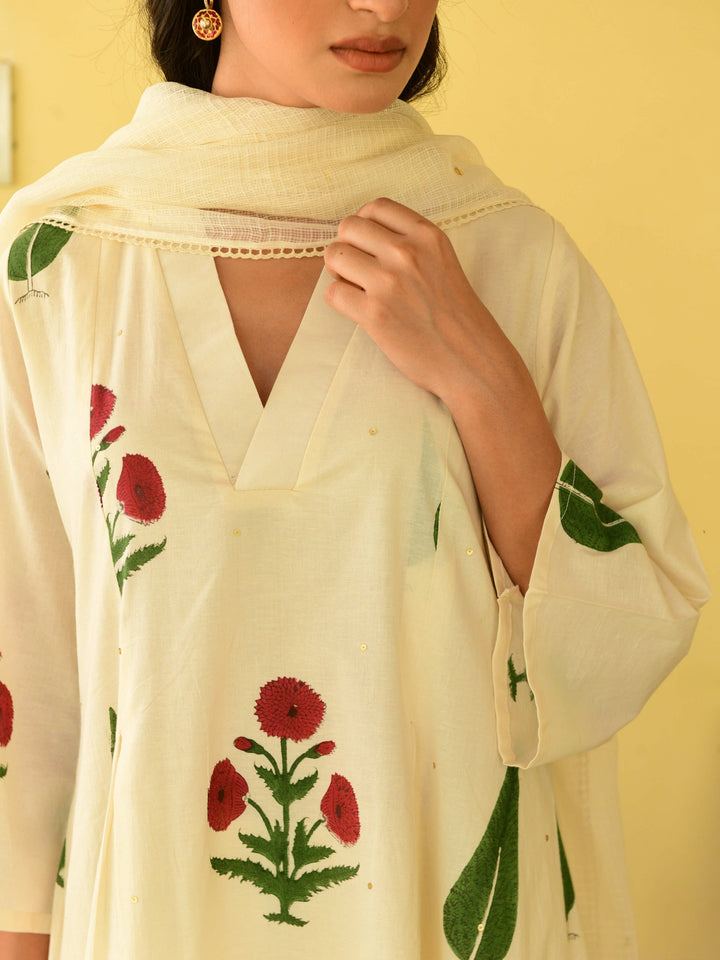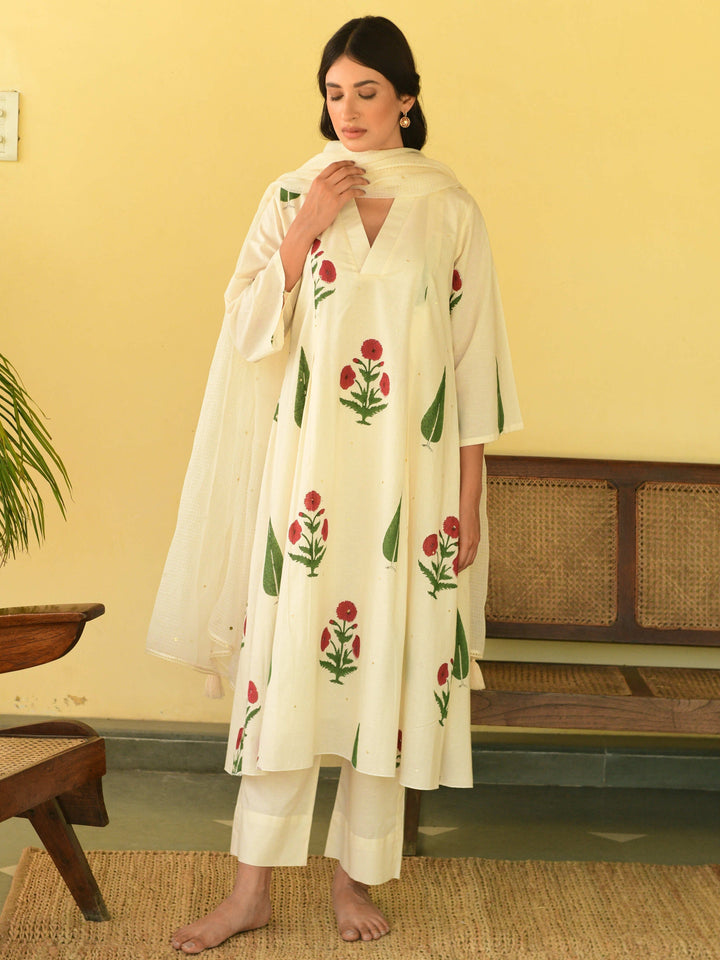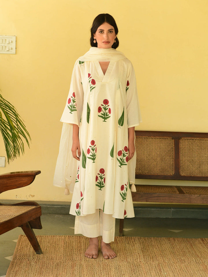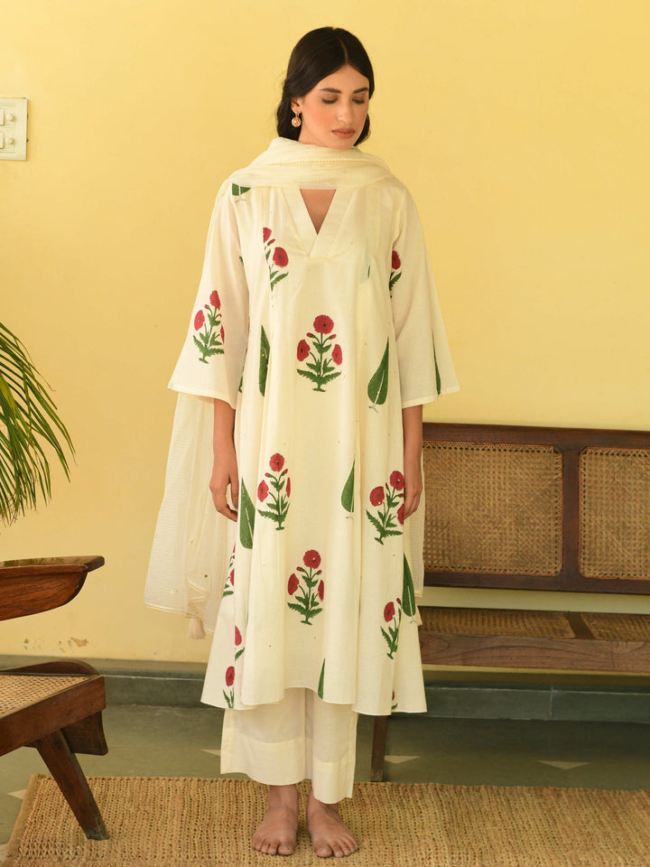 This three-piece set includes straight A-line kurta, pants, and dupatta. Mulmul cotton block printed straight A-line kurta with handwork detailing. Pants has elasticated waist and Mulmul cotton handblock printed dupatta with hand-work detailing.
