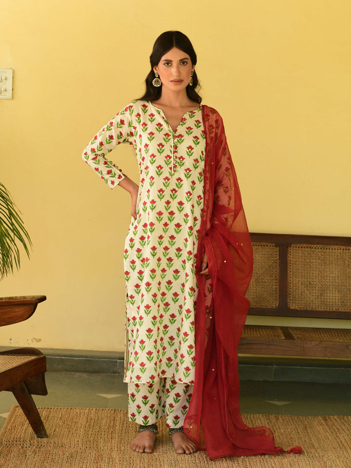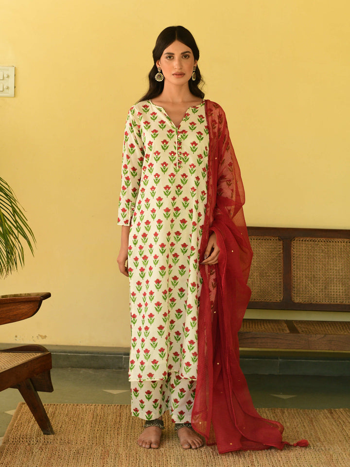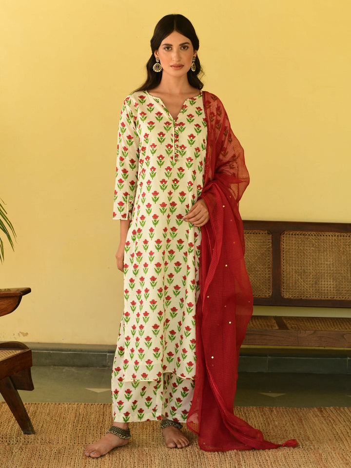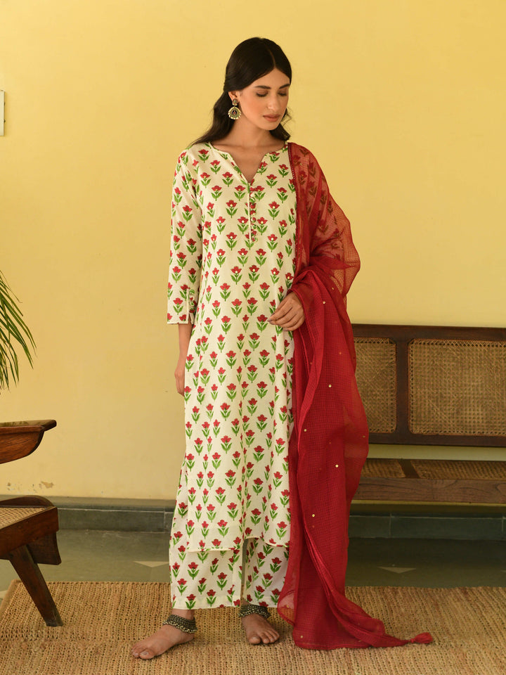 This three-piece set includes kurta, pants, and a dupatta. Mulmul cotton handblock printed straight kurta has buttons and handwork detailing. hand-block printed matching pants with an elasticated waist and kota doria dupatta with hand-work detailing.