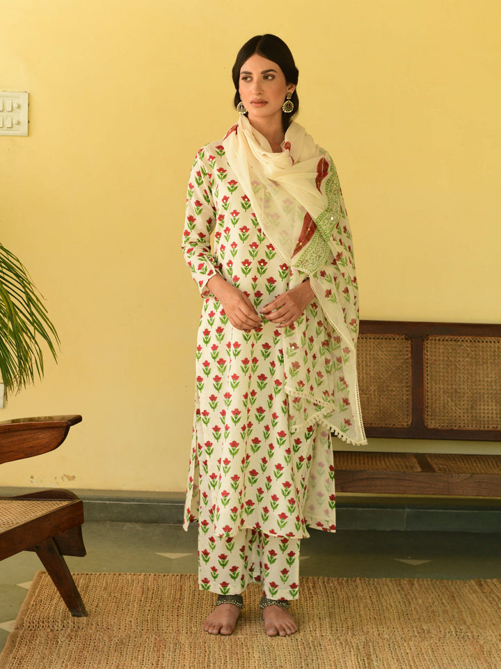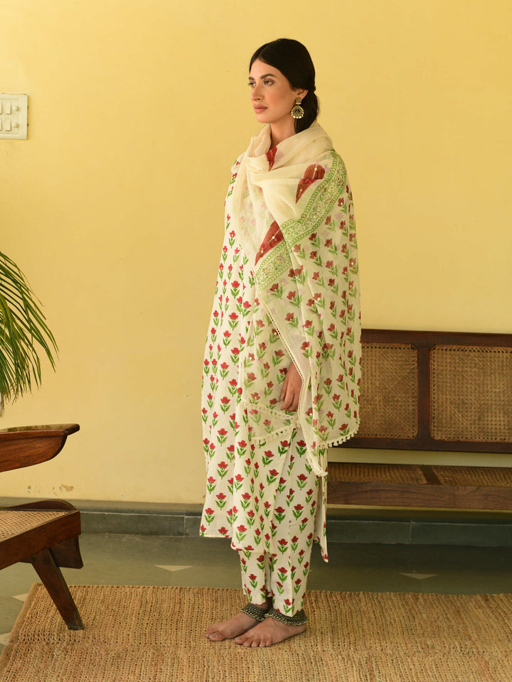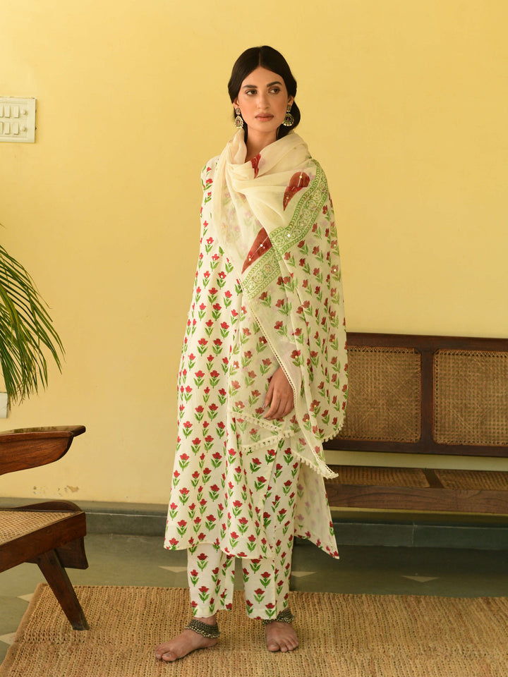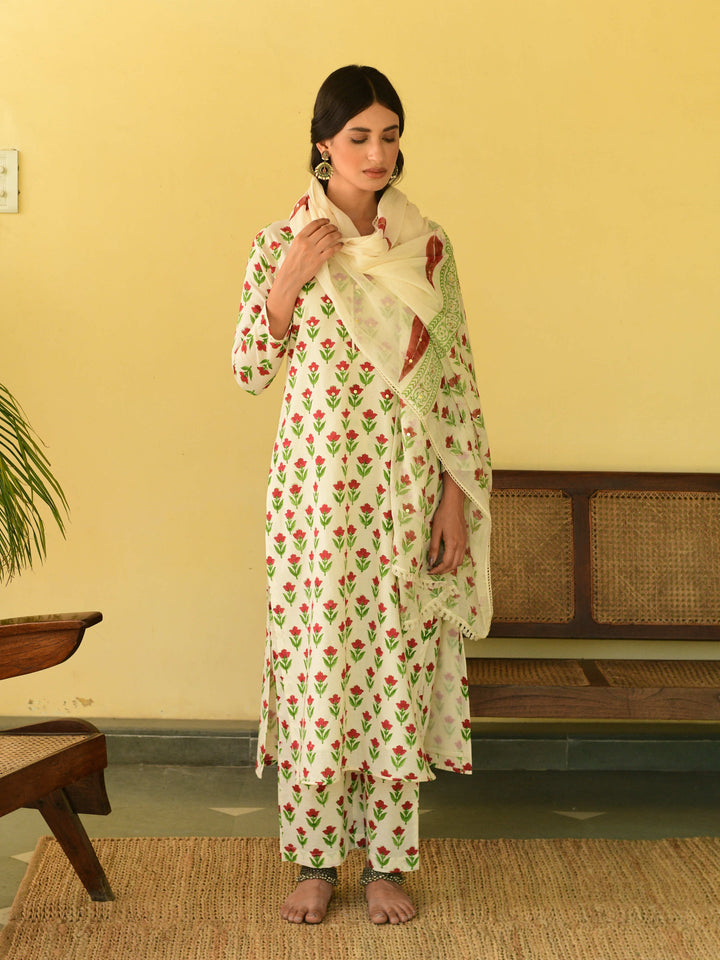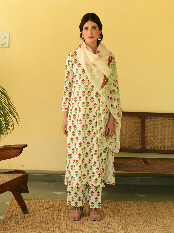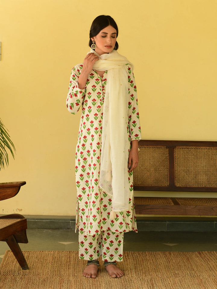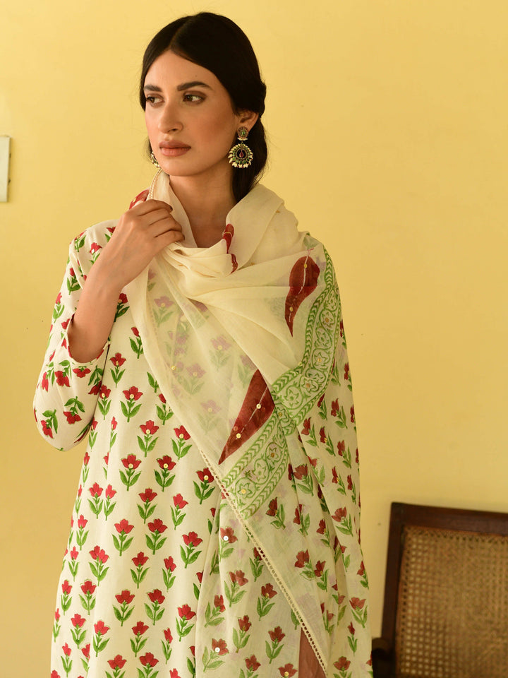 This three-piece set includes kurta, pants, and a dupatta. Mulmul cotton handblock printed straight kurta has buttons and handwork detailing. Handblock printed matching pants with an elasticated waist and mulmul handblock printed dupatta with hand-work detailing.