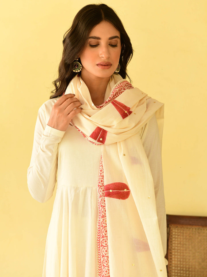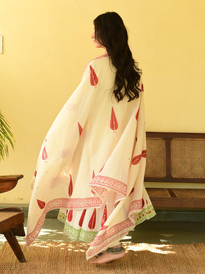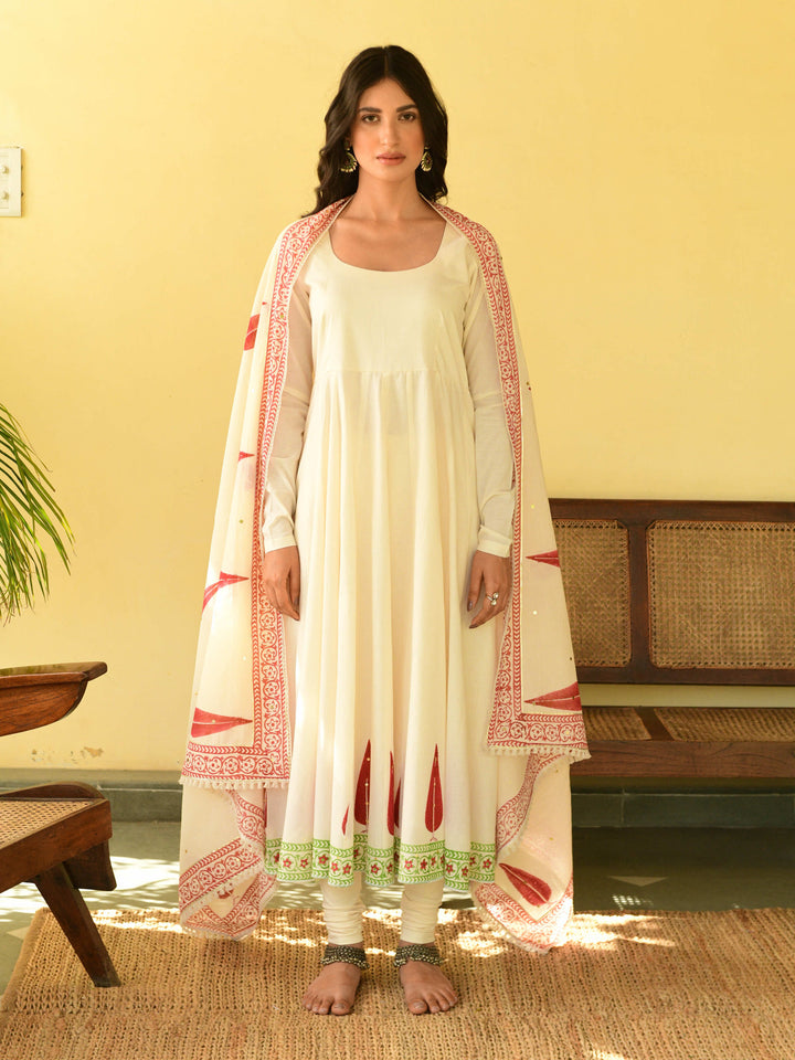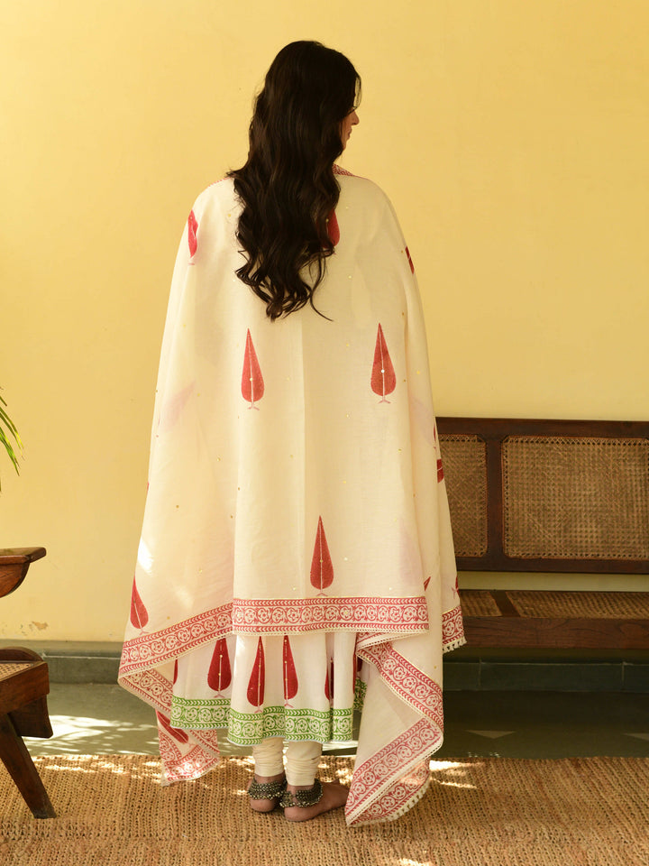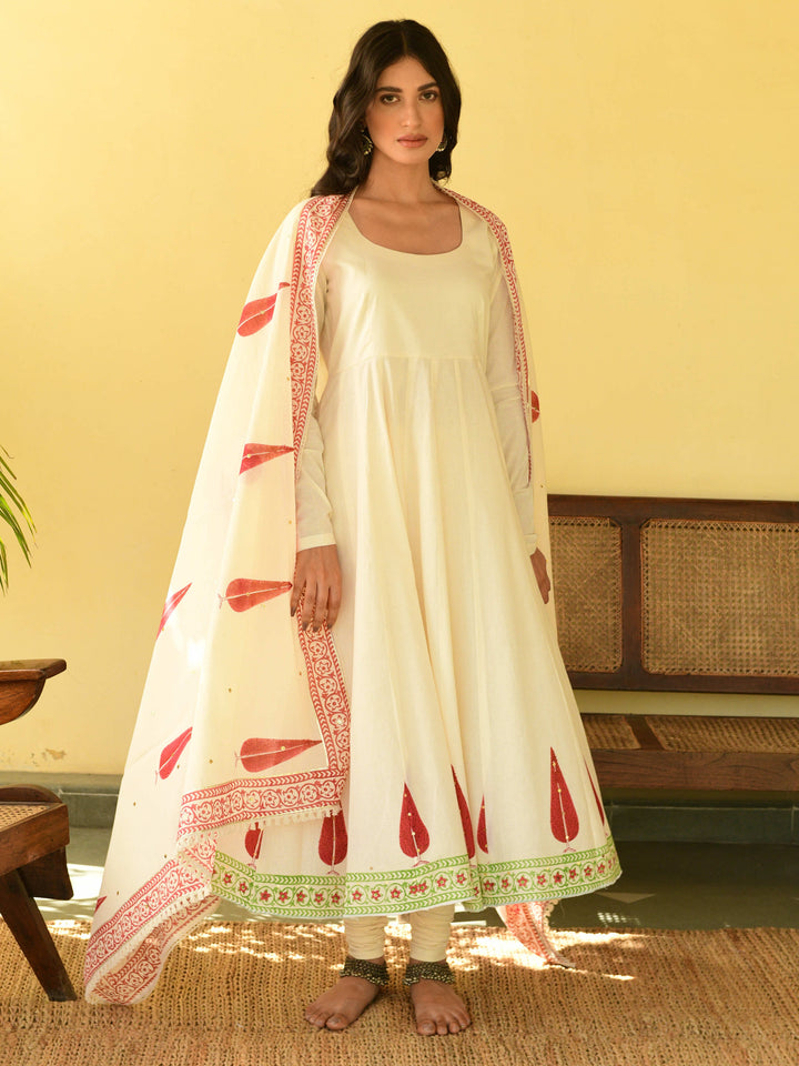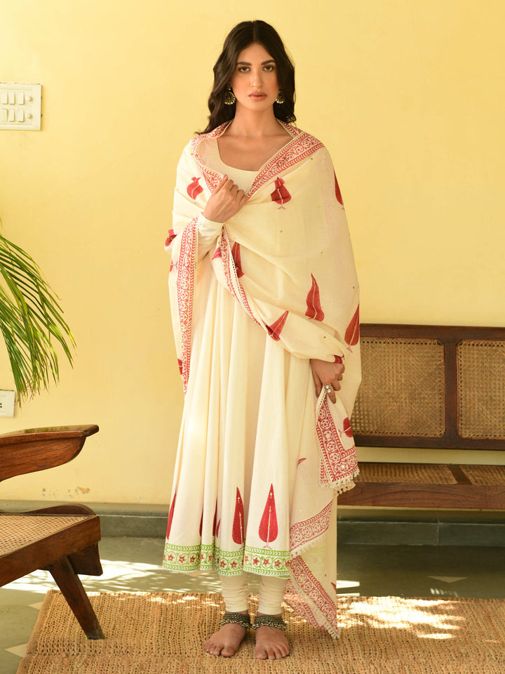 This three-piece set includes Anarkali, churidar, and dupatta. Mulmul cotton block printed anarkali with handwork detailing. Churidar and handblock printed mulmul dupatta with hand-work detailing.