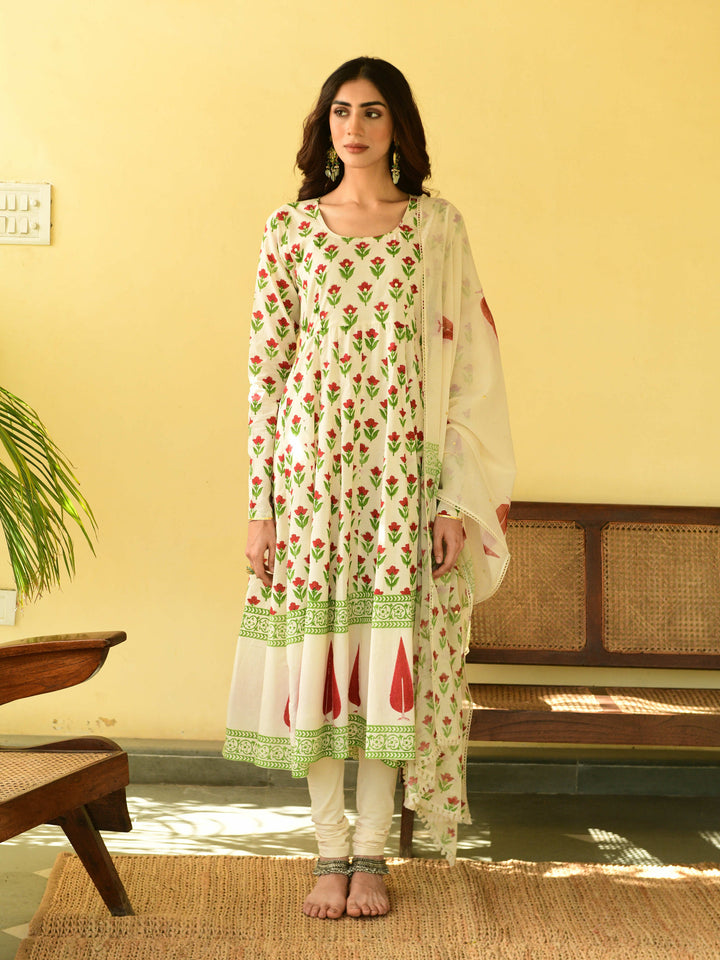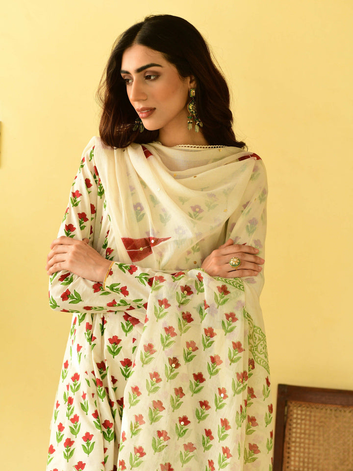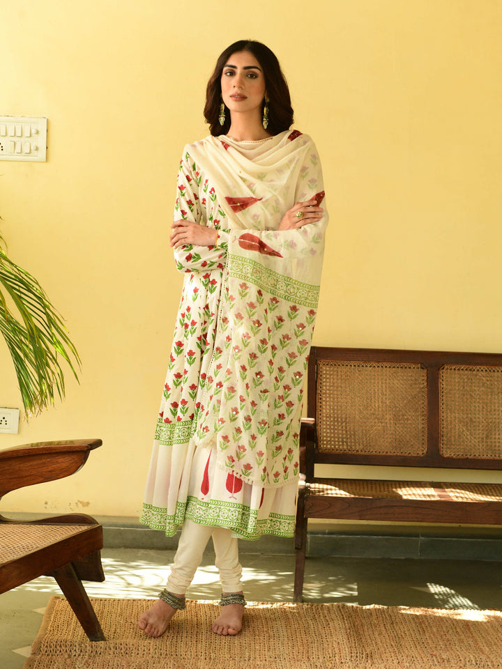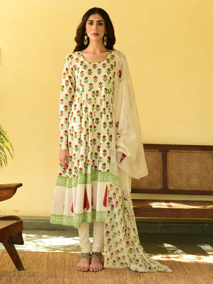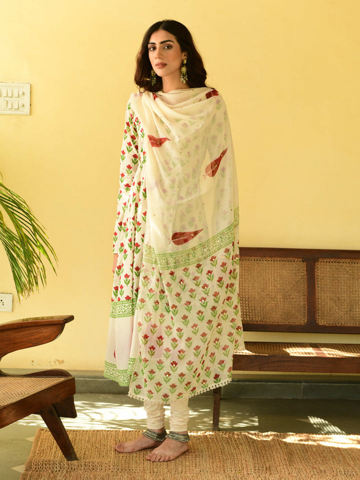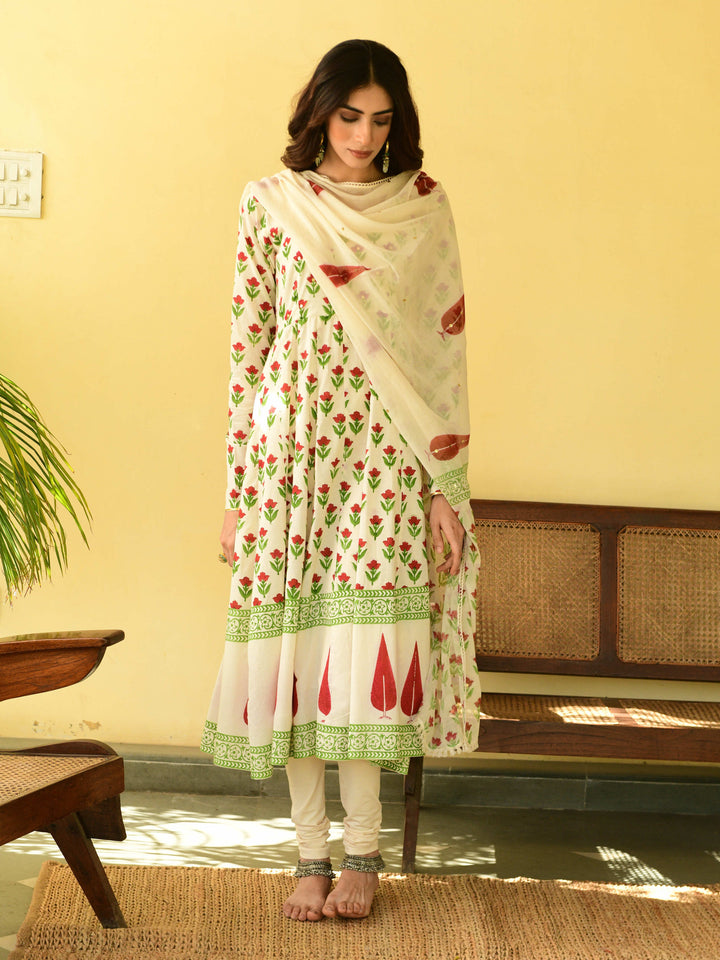 This three-piece set includes Anarkali, churidar, and dupatta. Mulmul cotton block printed anarkali with handwork detailing. Churidar and handblockprinted mulmul dupatta with hand-work detailing.