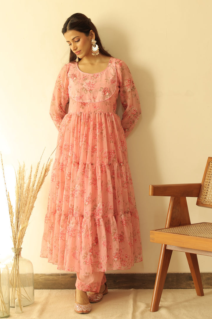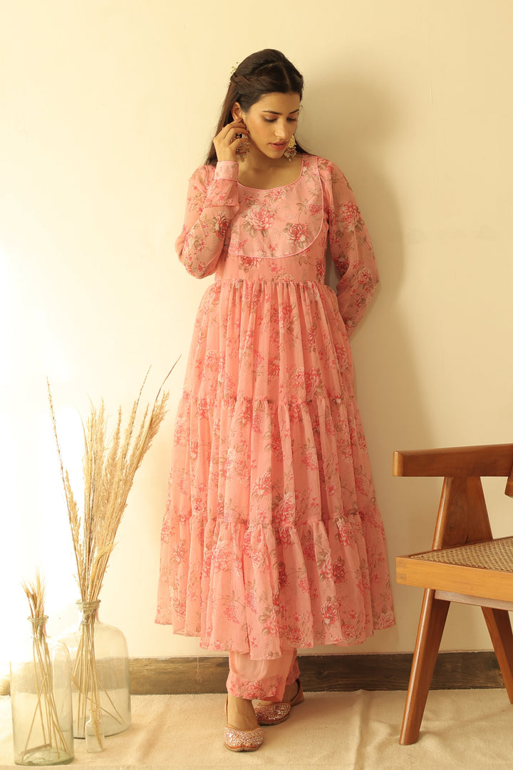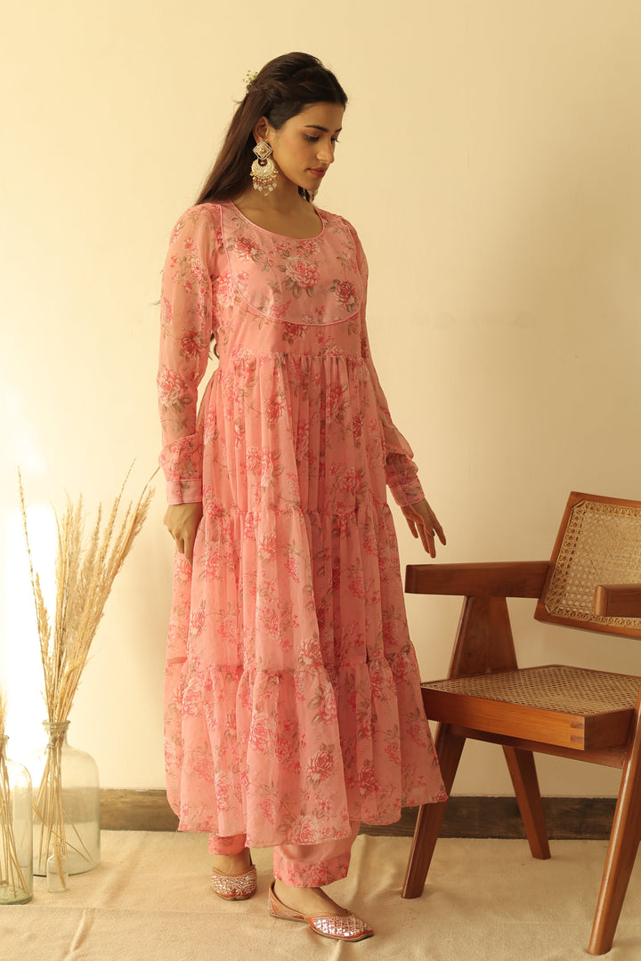 This three-piece set includes Anarkali, pants, and dupatta. Zaheen Pink anarkali in our classic printed georgette with gotta detailing. Georgette Pants has elasticated waist and dupatta with foil detailings.